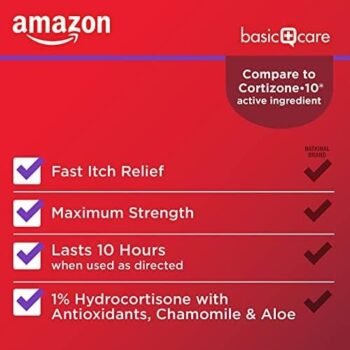 • Amazon Basic Care Maximum Strength Anti-Itch Cream, Hydrocortisone 1 Percent Intensive Healing Formula, Itch Relief For Bug Bites, Eczema, Psoriasis, Poison Ivy, Oak and Sumac, 1 ounce (Pack of 1) Health & Household $11.00