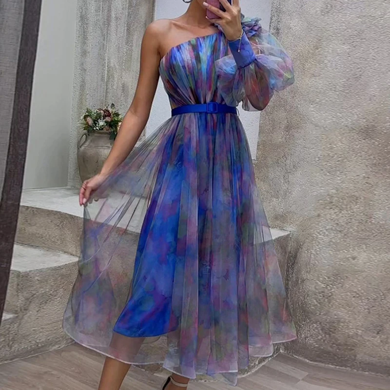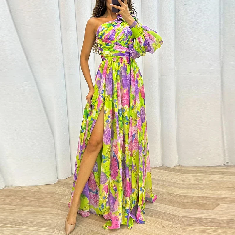 فستان طويل مطبوع بكتف واحد للنساء ، فستان سهرة نسائي ، فتحة جانبية ، حافة فضفاضة ، حفلة شاطئ ، مثير ، فستان للسيدات