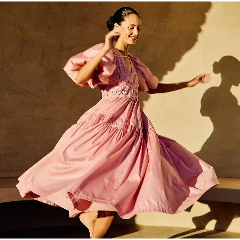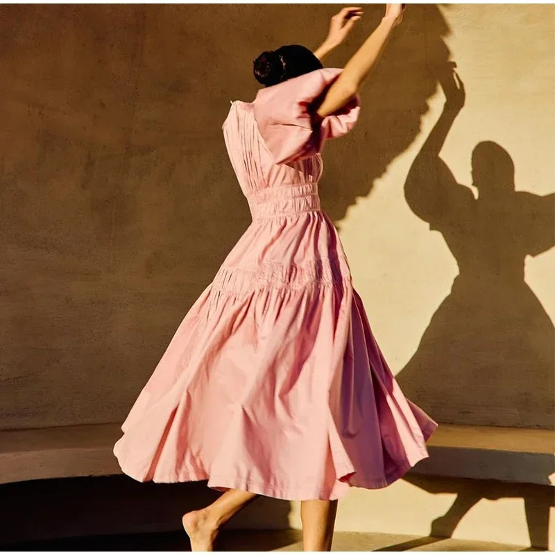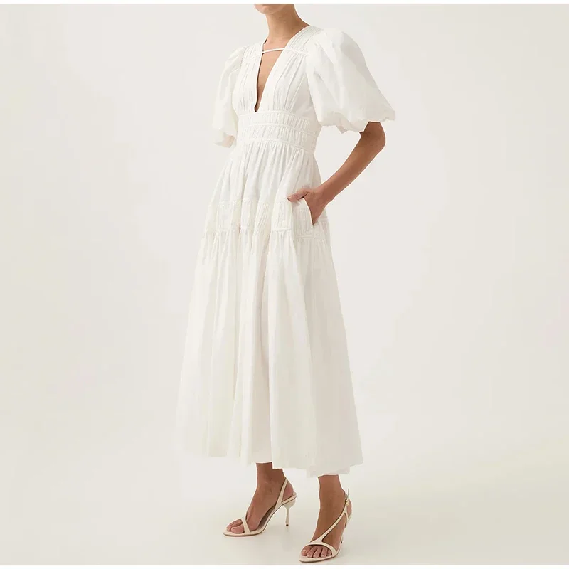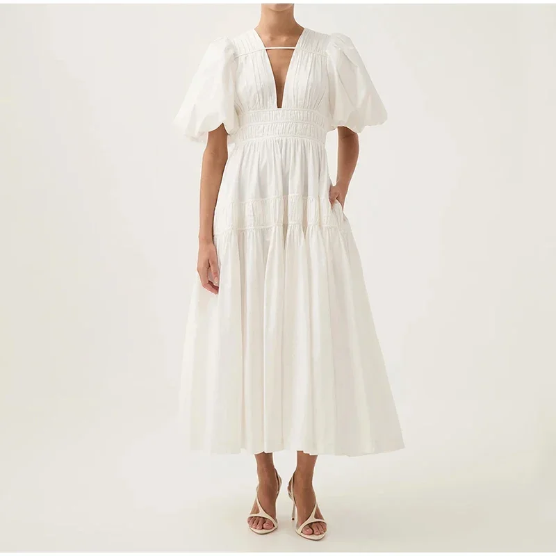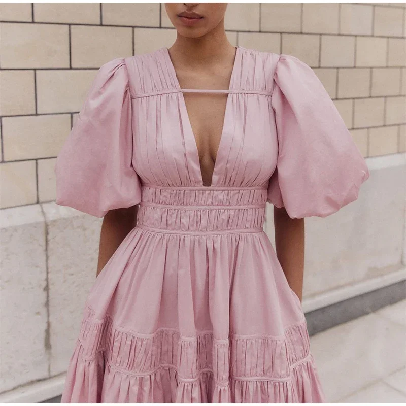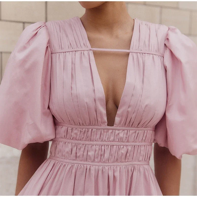 فستان طويل أنيق عالي الخصر أحادي اللون ، كم منفوخ ، رقبة حرف V عميقة ، فساتين ضيقة مرقعة ، فستان حفلات مسائية للسيدات ، موضة صيفية