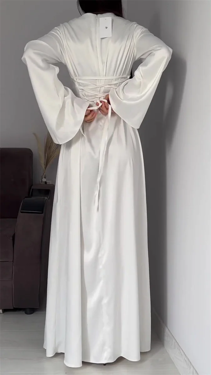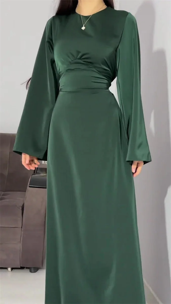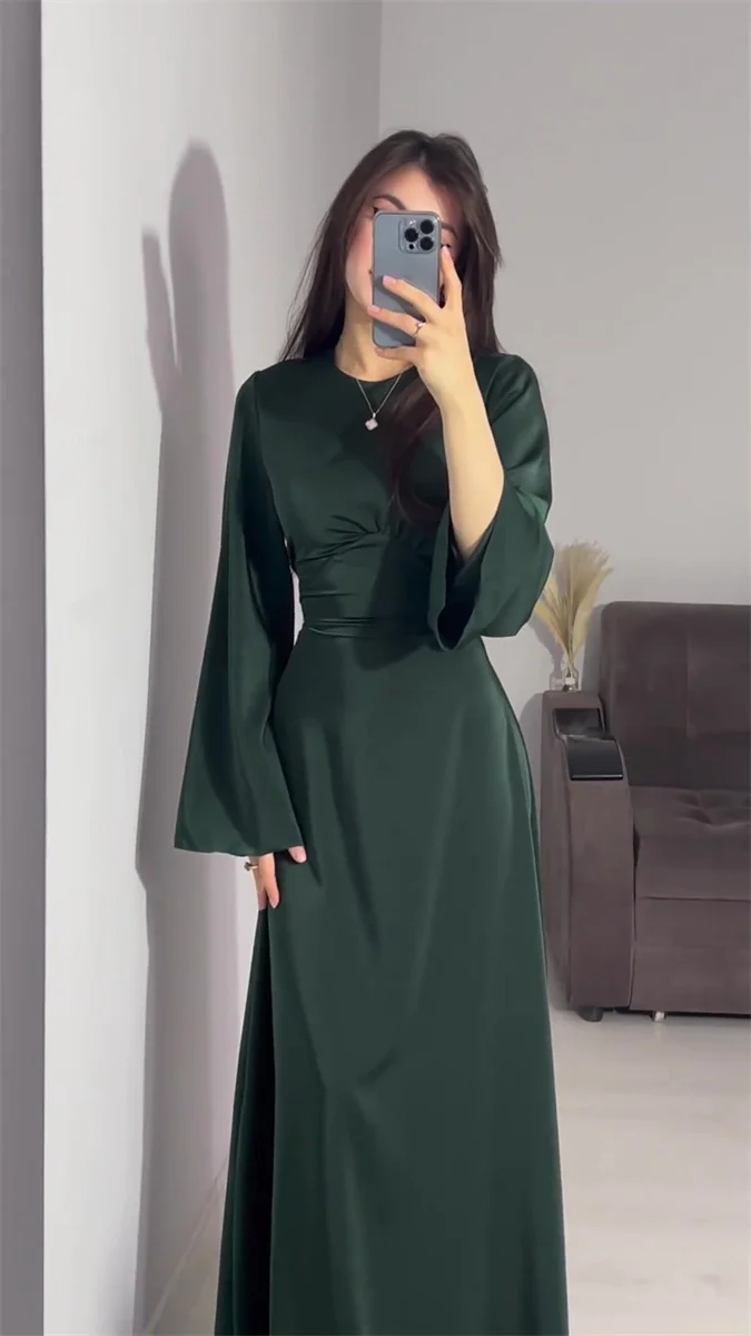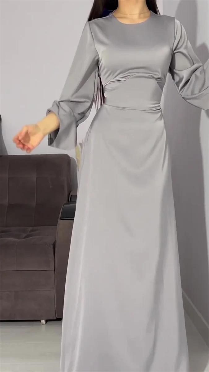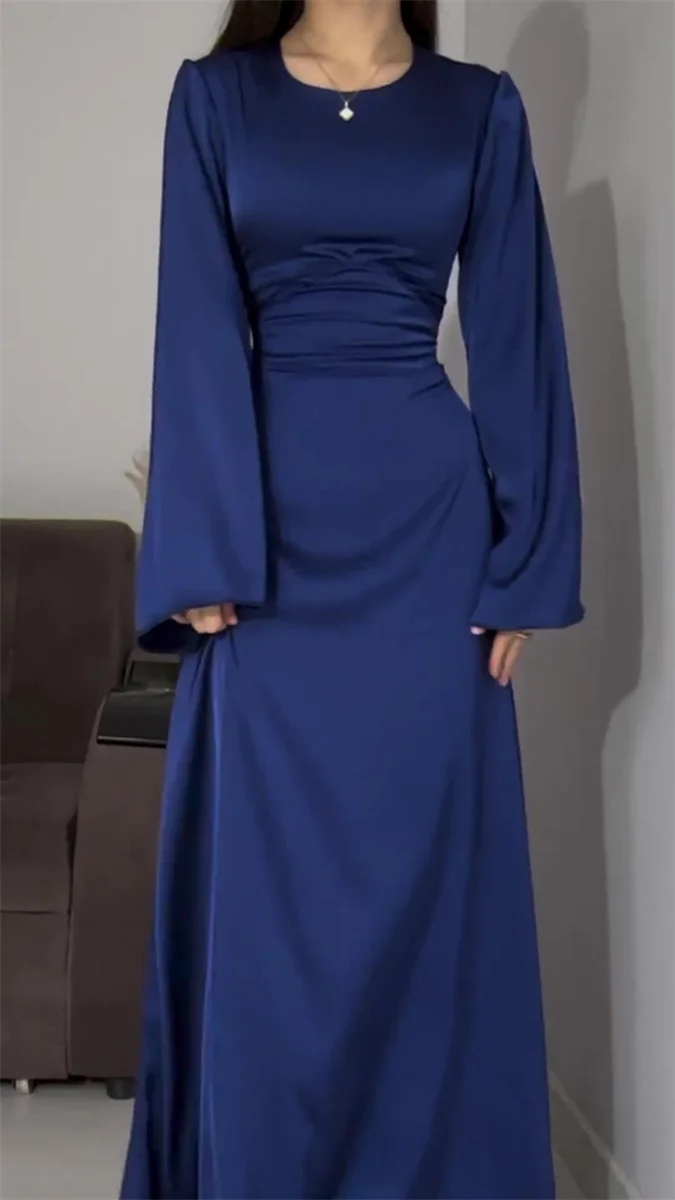فستان طويل بأربطة أنيقة سادة ، رقبة مستديرة طويلة ، أكمام مضيئة من الساتان ، تنورة ضيقة برباط ، فساتين حفلات مسائية ، أرواب أنيقة ، حرير