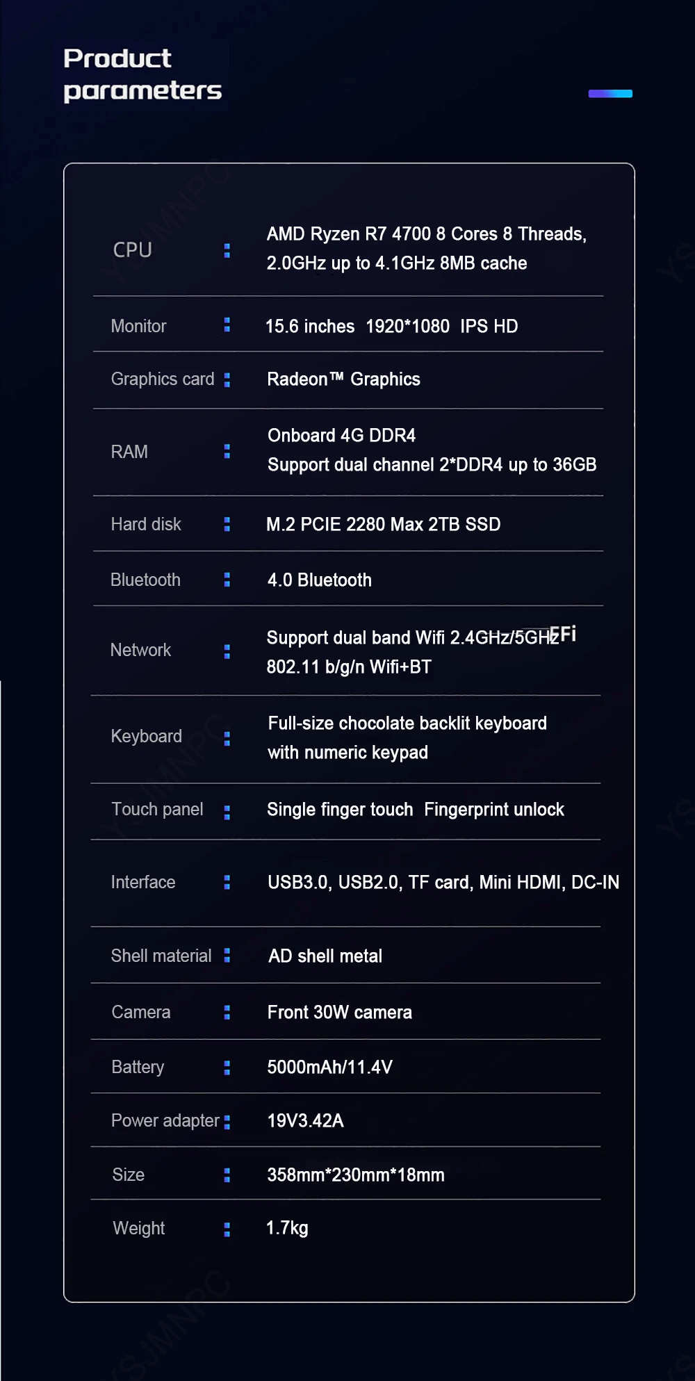 | Port | 1*USB3.0,1*USB2.0 |