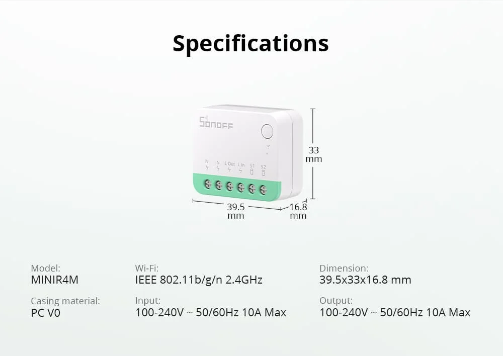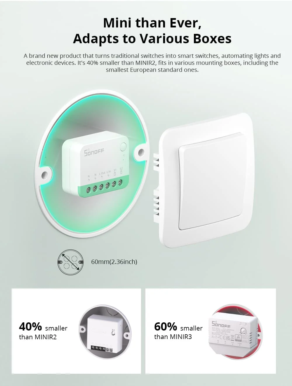 【Matter Compatible】SONOFF MINIR4M is a Matter-certified device, it can work with other brands of Matter end devices and integrate into Matter-enabled platforms, such as Alexa, Apple Home, Google Home, etc. Controlling all smart devices through one app is no longer a fantasy.