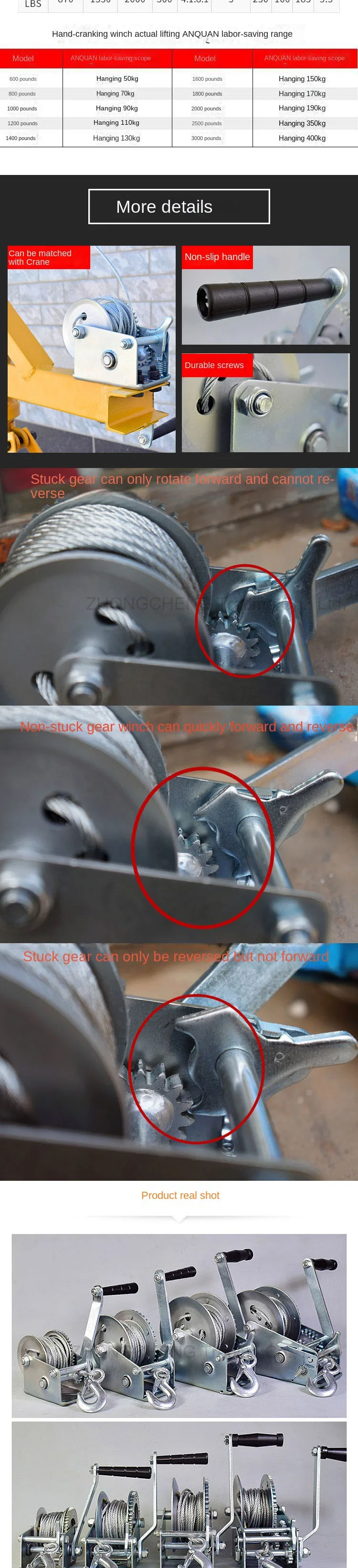 600 Lb-3000 Lb Wire Rope Lifting Winch Household Manual Hand Hoisting Winch Self-locking Traction Machine with Steel Wire Rope