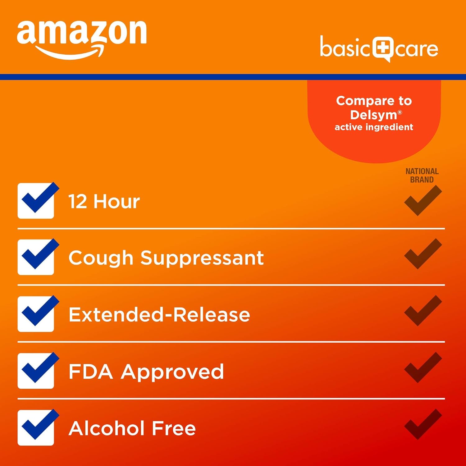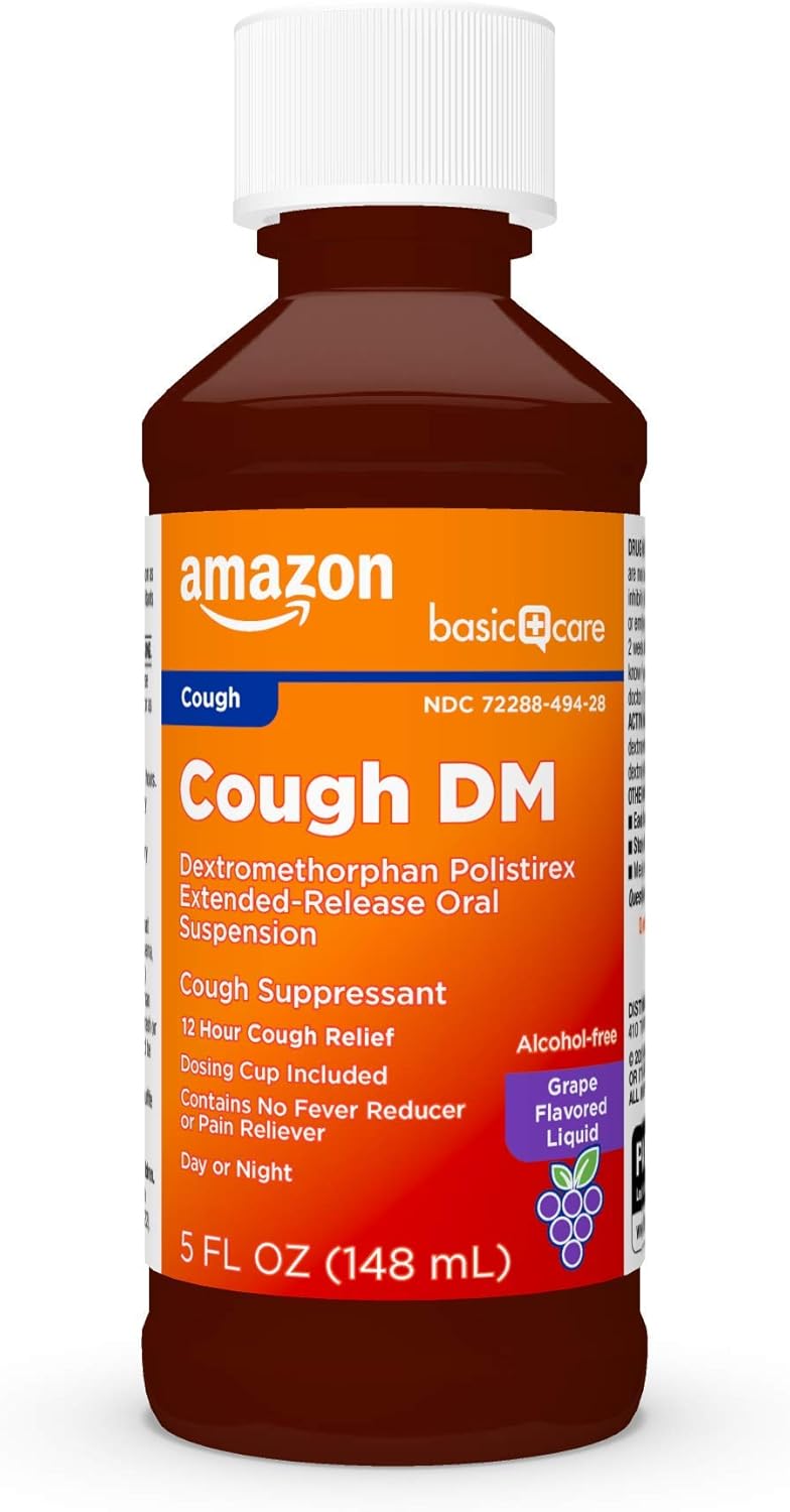 About this item ACTIVE INGREDIENT: This product contains dextromethorphan polistirex equivalent to 30 mg dextromethorphan hydrobromide, a cough suppressant, which compares to the active ingredient in Delsym Orange Flavor COUGH SUPPRESSANT LIQUID: Amazon Basic Care 12 Hour Cough DM helps to relieve cough due to minor throat and bronchial irritation as may occur with the common cold or inhaled irritants and the impulse to cough to help you get to sleep ORANGE FLAVORED COUGH MEDICINE: Get day or night relief from coughing with this orange flavored cough syrup GLUTEN AND ALCOHOL FREE: Amazon Basic Care Dextromethorphan Polistirex Extended-Release Oral Suspension provides cough relief so you can feel better during the day or get sleep at night An Amazon Brand