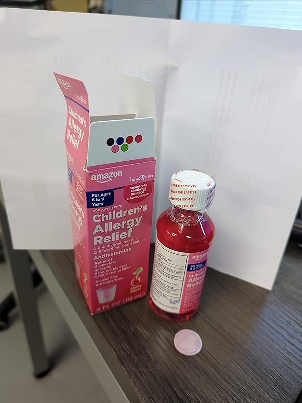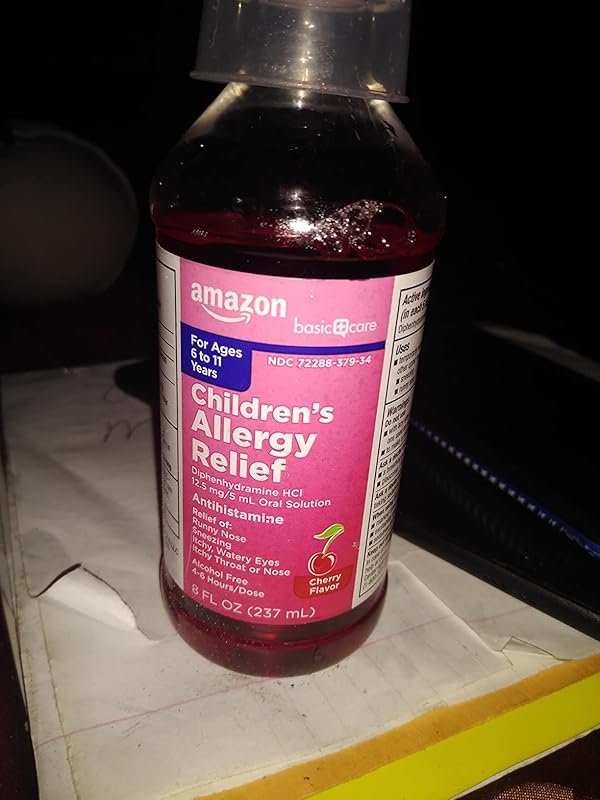 About this item ACTIVE INGREDIENT: Amazon Basic Care Children’s Allergy Relief contains Diphenhydramine HCl 12.5 mg/5 mL, an antihistamine, which compares to the active ingredient in Children’s Benadryl Allergy Liquid CHERRY FLAVOR: Temporarily relieves symptoms due to hay fever or other upper respiratory allergies – in a cherry flavor kids will love MULTI-SYMPTOM ALLERGY RELIEF: Provides temporary multi-symptom relief of sneezing, runny nose, itching of the nose or throat and itchy, watery eyes 4-6 HOURS OF ALLERGY RELIEF: Relieves allergies for up to 4-6 hours per dose when taken as directed; dosage cup included GLUTEN FREE: This complete allergy medicine is gluten free and alcohol free; for kids ages 6-11