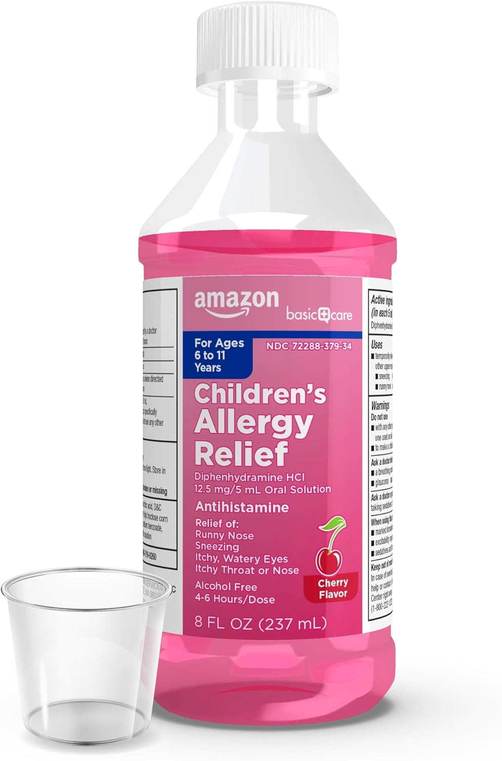 Amazon Basic Care Children's Allergy Relief Liquid, Kids Allergy Medicine with Diphenhydramine HCl, Antihistamine, Cherry Flavor, for Children Ages 6-11 Years, 8 fl oz (Pack of 1) Health & Household