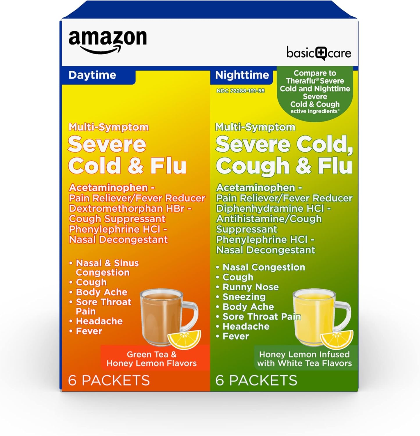 About this item COMPARE to Theraflu Severe Cold and Nighttime Severe Cold & Cough active ingredients. DAYTIME ACTIVE INGREDIENTS: Amazon Basic Care Severe Cold Daytime contains acetaminophen (a pain reliever and fever reducer), dextromethorphan HBr (a cough suppressant) and phenylephrine HCl (a nasal decongestant). NIGHTTIME ACTIVE INGREDIENTS: Amazon Basic Care Severe Cold & Cough Nighttime contains acetaminophen (a pain reliever and fever reducer), diphenhydramine HCl (an antihistamine and cough suppressant) and phenylephrine HCl (a nasal decongestant). HOT LIQUID THERAPY: Helps to relieve nasal and sinus congestion, cough, body aches, sore throat pain, headache, fever during the day and nasal congestion, cough, runny nose, sneezing, body aches, sore throat pain, headache and fever at night. WARM, SOOTHING COLD AND FLU RELIEF: Amazon Basic Care Severe Cold Daytime has a green tea and honey lemon flavor while Amazon Basic Care Severe Cold & Cough Nighttime has honey lemon infused with white tea flavors. › See more product details