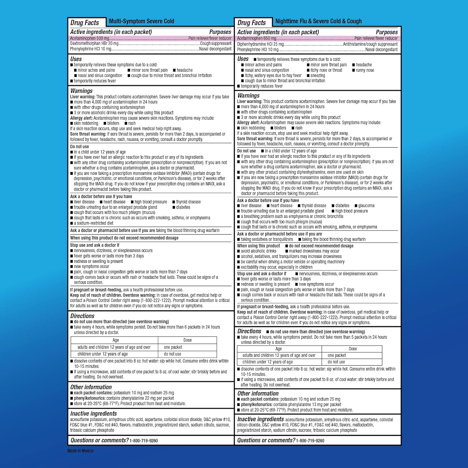 Compare to Theraflu Severe Cold and Nighttime Severe Cold & Cough active ingredients. Sip your way to cold and flu relief with Amazon Basic Care Multi-Symptom Severe Cold Daytime and Severe Cold & Cough Nighttime Combination Pack. This combo pack provides daytime and nighttime hot liquid therapy for fast, soothing relief of severe cold symptoms. Amazon Basic Care Severe Cold Daytime has a green tea and honey lemon flavor for non-drowsy relief of nasal and sinus congestion, sore throat pain, headaches, body aches, fever, cough and pain. Amazon Basic Care Severe Cold & Cough Nighttime has a honey lemon infused with white tea flavors that relieves nasal and sinus congestion, sore throat pain, runny nose, headaches, body aches, fever, cough, sneezing and pain. This combo pack contains pain reliever and fever reducer, cough suppressant, nasal decongestant, and antihistamine. Gluten free. Made in Mexico. Antihistamine in Nighttime only.