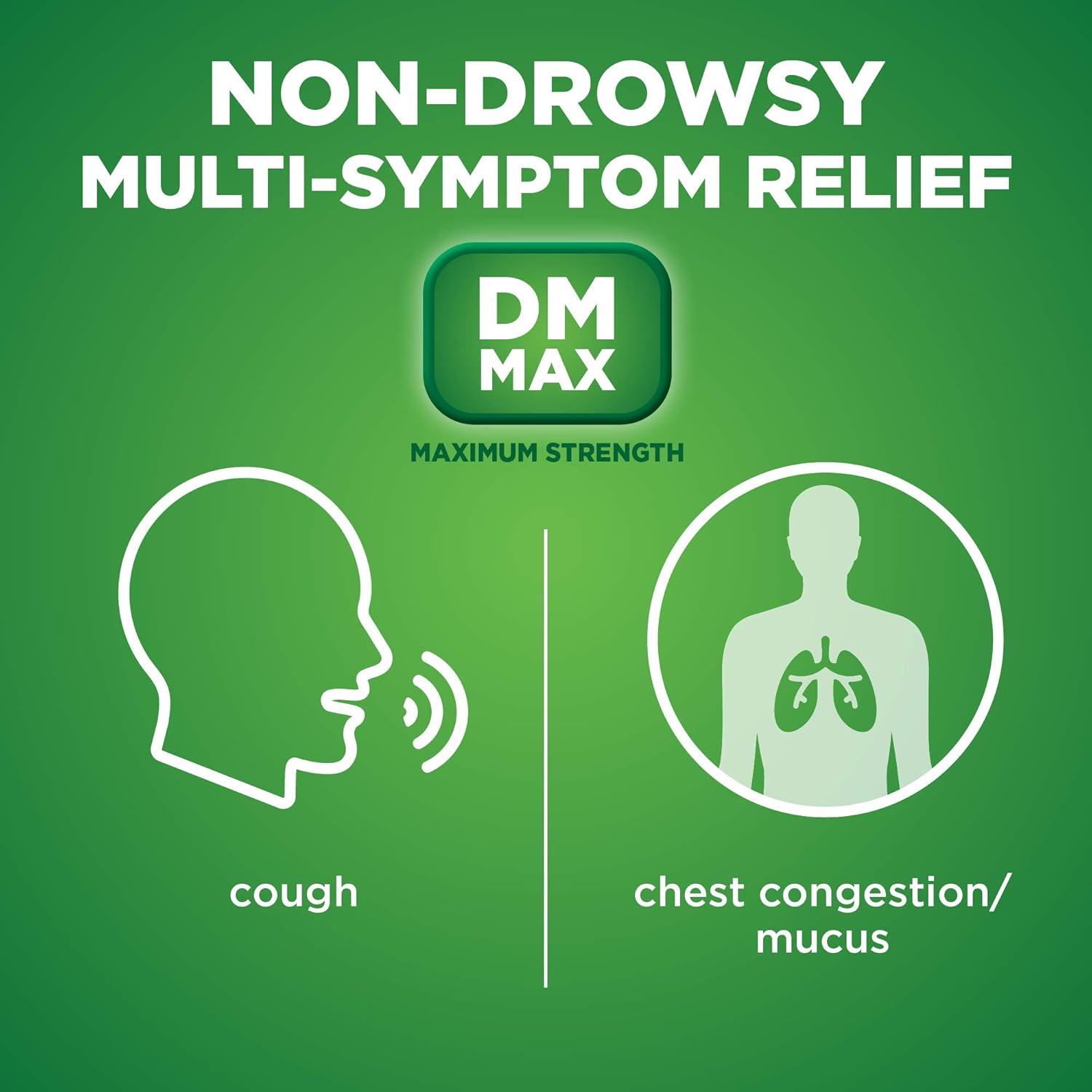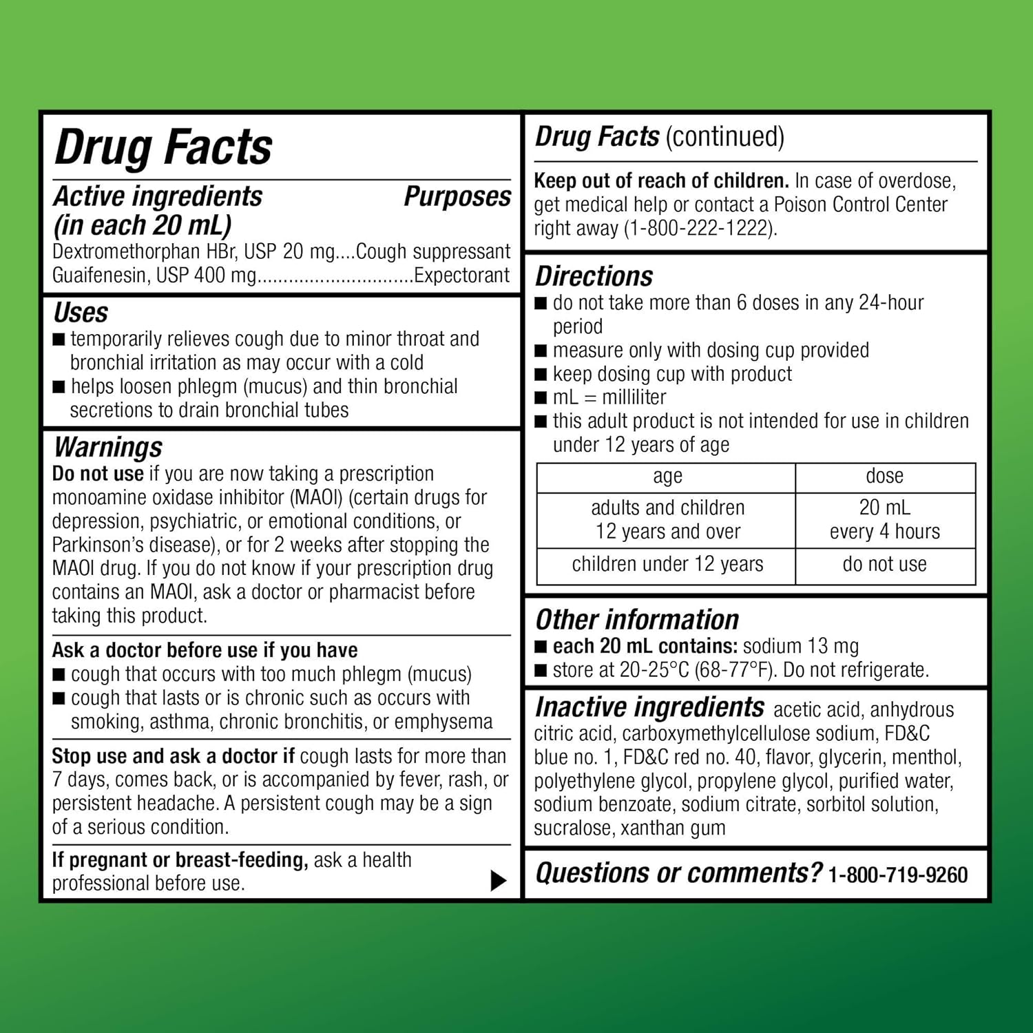 About this item ACTIVE INGREDIENTS: This cough medicine contains dextromethorphan HBr (a cough suppressant) and guaifenesin (an expectorant) which compare to the active ingredients in Robitussin Maximum Strength Cough and Chest Congestion DM MAXIMUM STRENGTH: Get maximum strength mucus relief from Amazon Basic Care, a brand you trust; maximum strength claim based on maximum daily dose of active ingredients COUGH SUPPRESSANT: This cough syrup helps to control your cough; temporarily relieves cough due to minor throat and bronchial irritation as may occur with a cold EXPECTORANT: Clear your excess mucus; each 20mL dose helps loosen phlegm (mucus) and thin bronchial secretions to drain bronchial tubes NON-DROWSY FORMULA: Don’t let a nagging cough drag down your day; take this non-drowsy, alcohol-free daytime liquid cough medicine to relieve your cough and cold symptoms; for adults and children 12 and over
