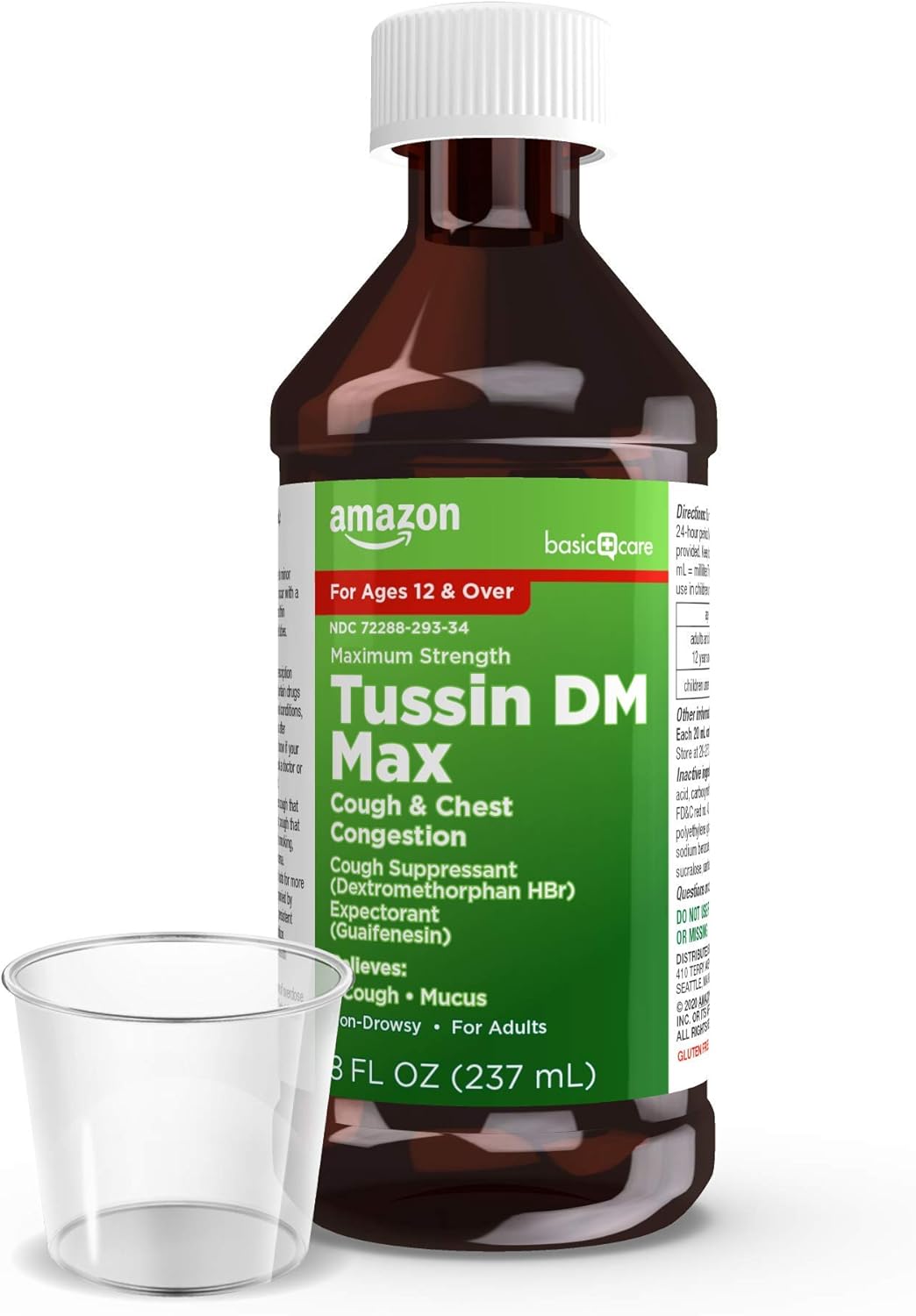 Amazon Basic Care Tussin DM MAX, Cough and Cold Medicine Syrup, Maximum Strength Mucus and Congestion Relief, Non-Drowsy, Raspberry Menthol Flavor, 8 fl oz (Pack of 1) Health & Household