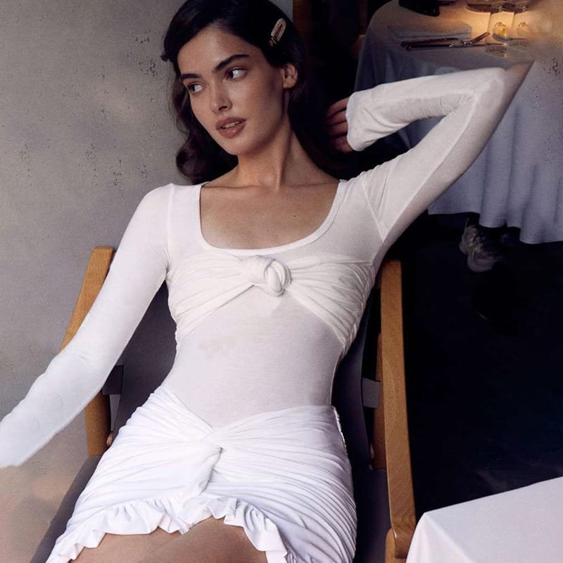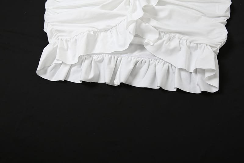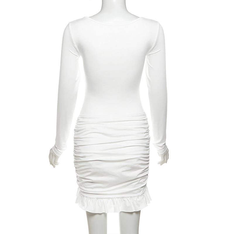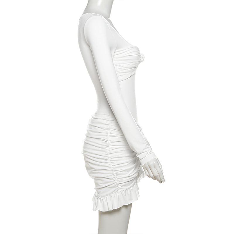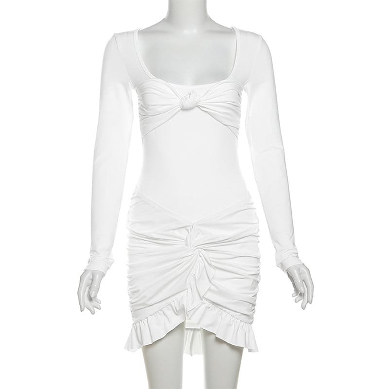 BKQU Ruched Bodycon Dress Women Sexy Long Sleeve Twist Ruffles Hem Mini Dresses Autumn White Elegant Club Party Short Vestidos