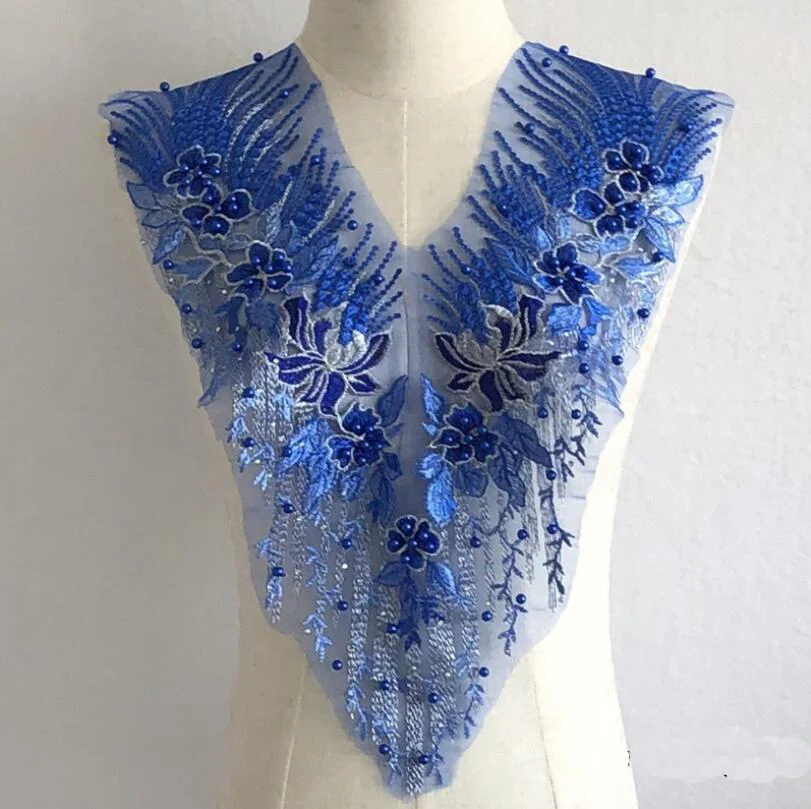 Blue Frence Fabric Lace Trimmings Sequins Patches Designs Appliques For Prom Ball Gown Wedding Dress Costumes Diy Party