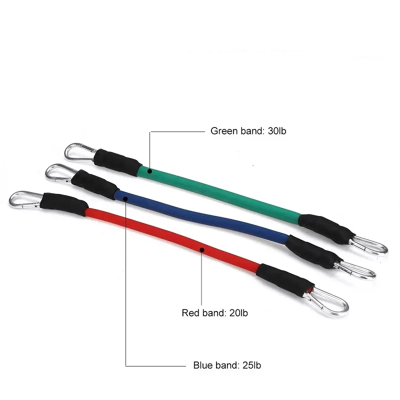 3 Color Bands each with different level of tension: Green band: 30lb, Blue band: 25lb, Red band: 20lb