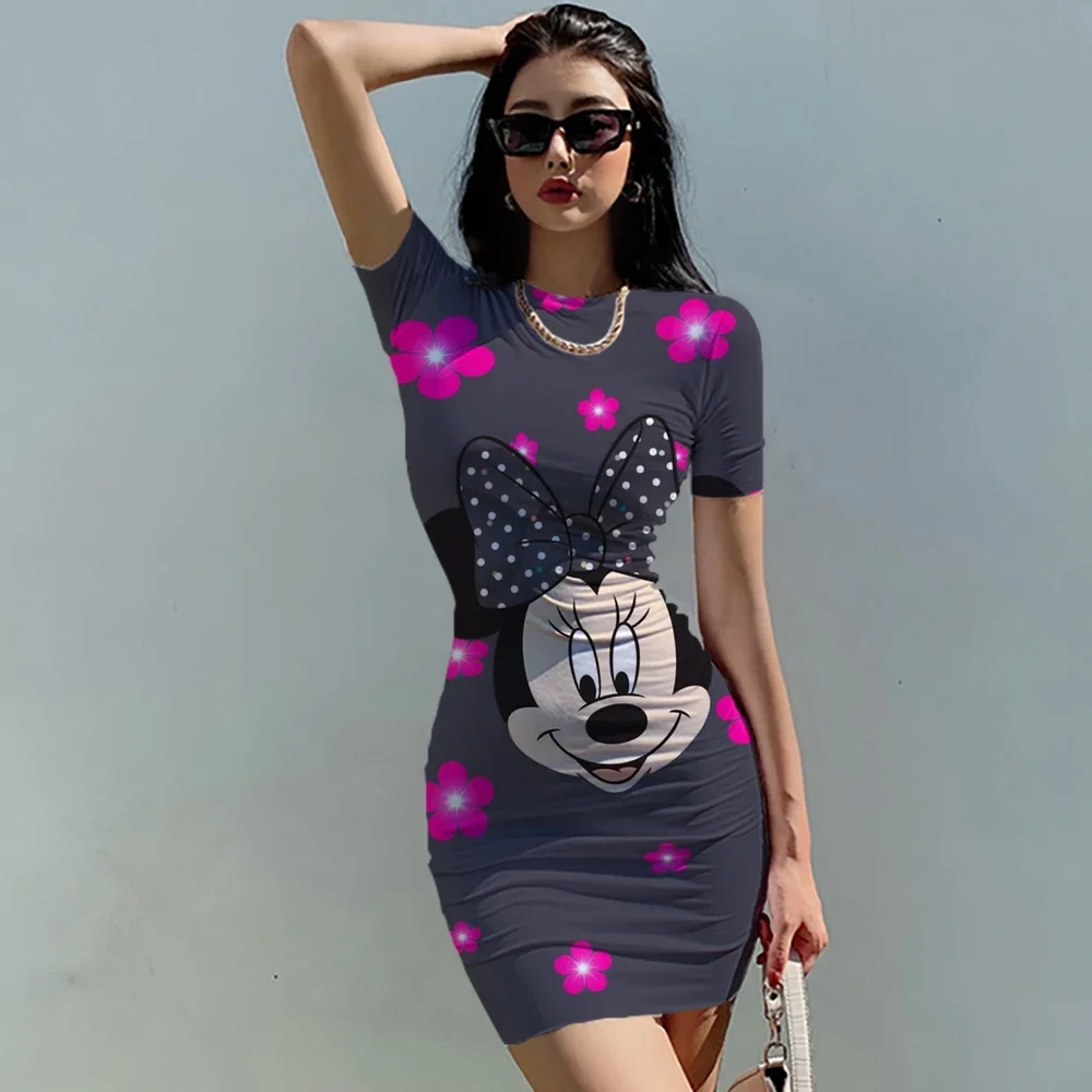 Disney Minnie Mickey Mouse bow print Elegant Pencil Dress Womens Simple Sheath Office Dresses Summer Short sleeve Casual Vestido