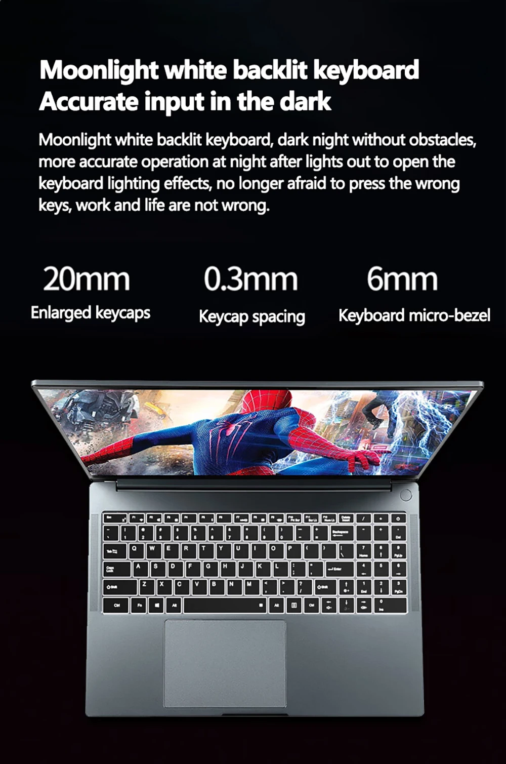 Moonlight white backlit keyboard, dark night without obstacles.more accurate operation at night after lights out to open the keyboard lighting effects, no longer afraid to press the wrongkeys, work and life are not wrong.