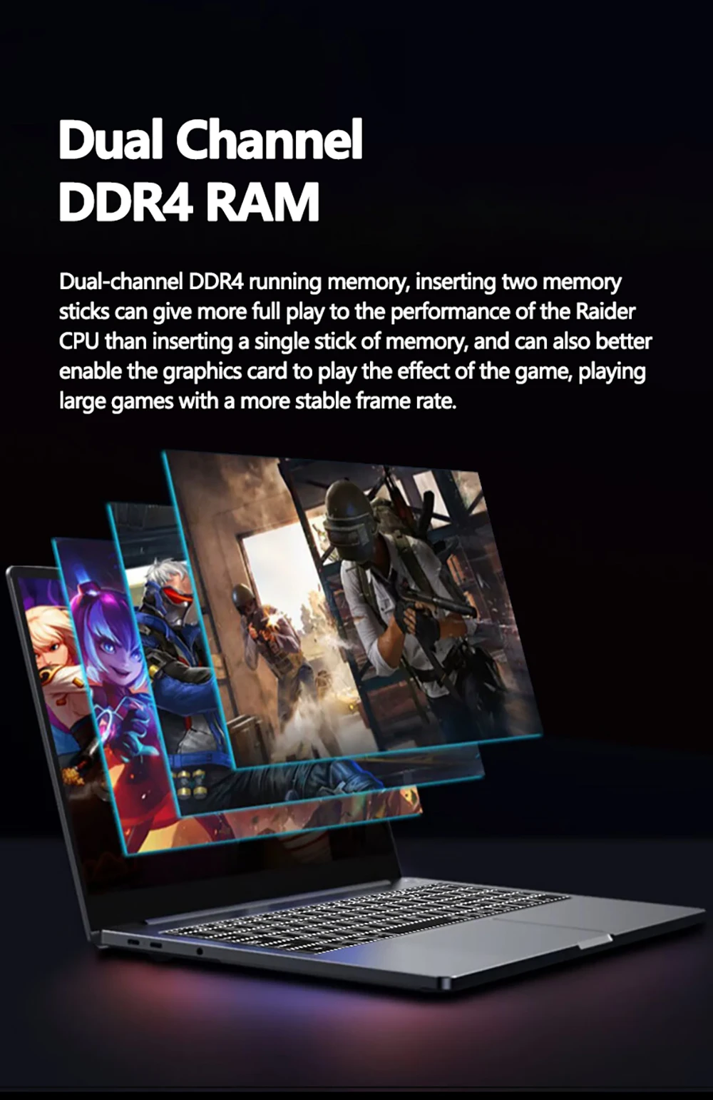 Dual-channel DDR4 running memory, inserting two memory sticks can give more full play to the performance of the Raider CPU than inserting a single stick of memory, and can also better enable the graphics card to play the effect of the game, playing large games with a more stable frame rate.
