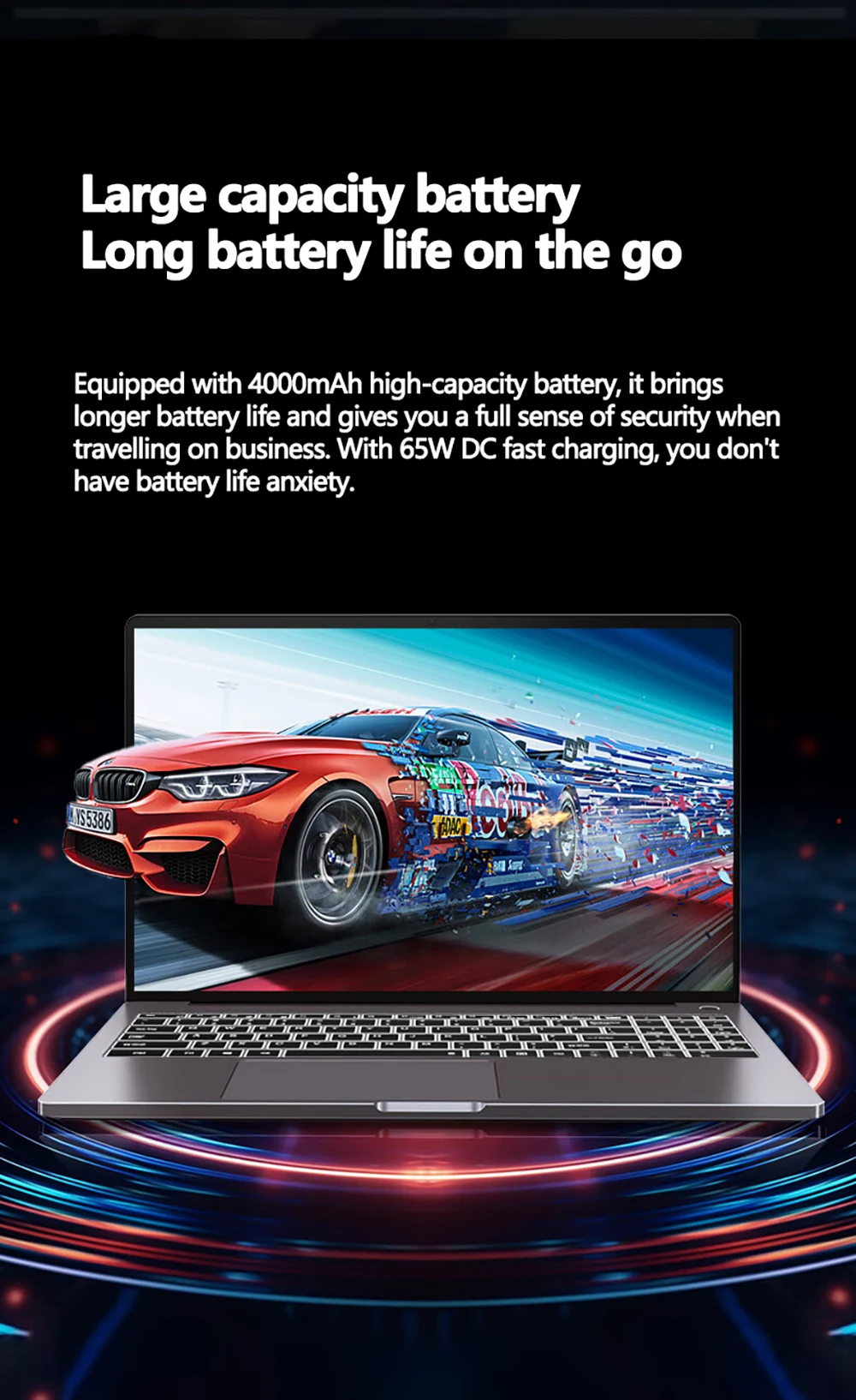 Equipped with 4000mAh high-capacity battery, it brings longer battery life and gives you a full sense of security when travelling on business. With 65W DC fast charging, you don’t have battery life anxiety.