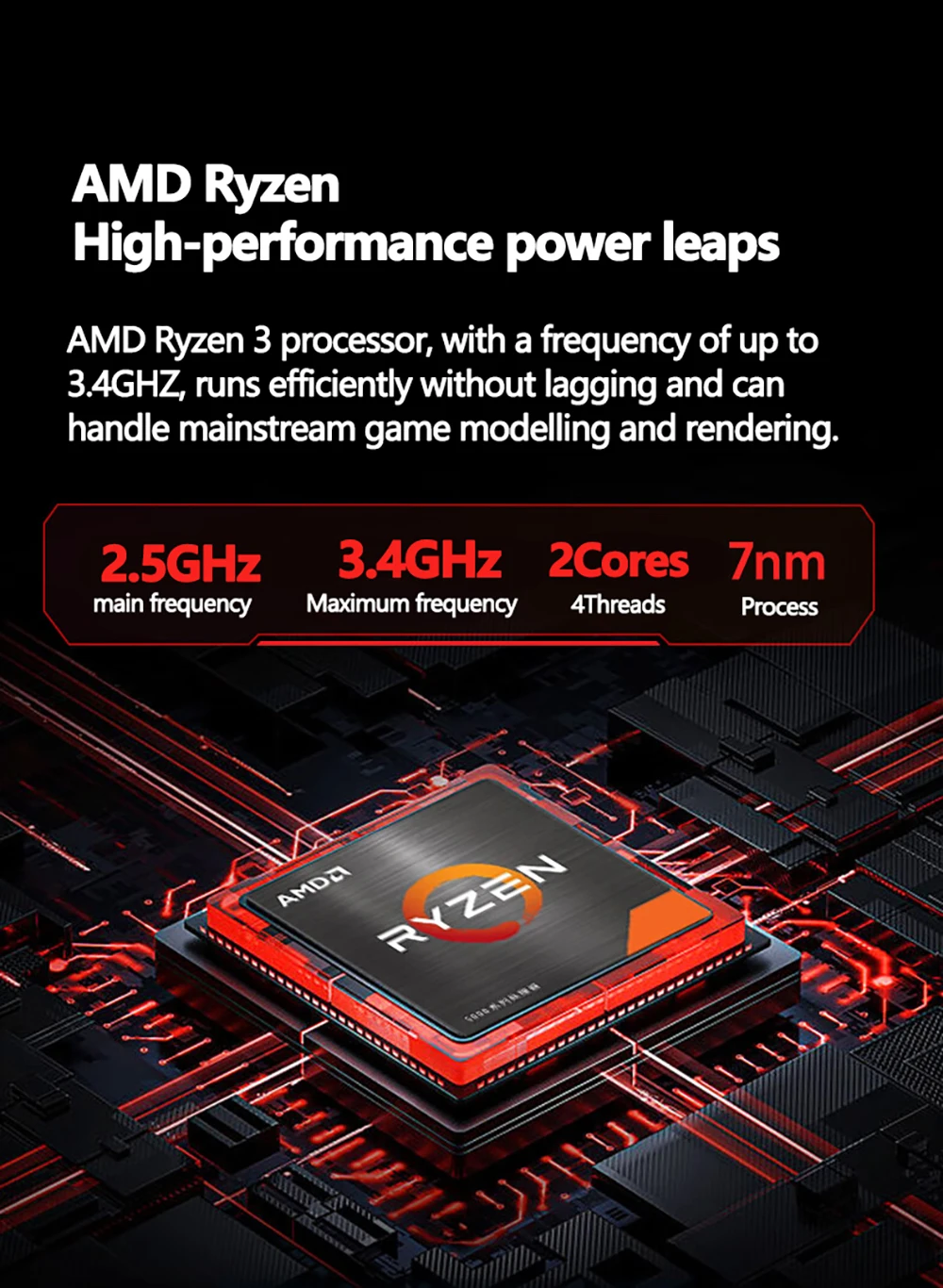 AMD Ryzen 3 processor, with a frequency of up to 3.4GHZ, runs efficiently without lagging and can handle mainstream game modelling and rendering.