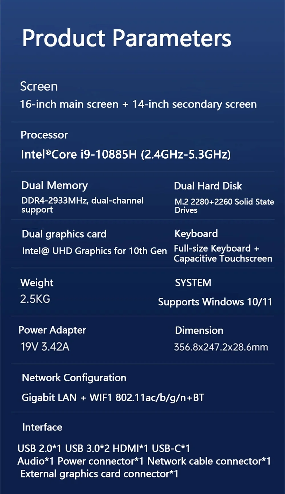 Intel Core i9-10885H 16.1+14.1 Inch Dual Screen 64GB DDR4 4TB SSD Touchpad HD Camera 8 Cores 16 Threads 5GHz Gaming Laptop