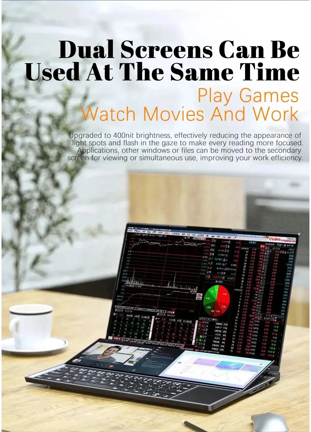 Upgraded to 400nit brightness, effectively reducing the appearance of light spots and flash in the gaze to make every reading more focused. Applications, other windows or files can be moved to the secondary screen for viewing or simultaneous use, improving your work efficiency.