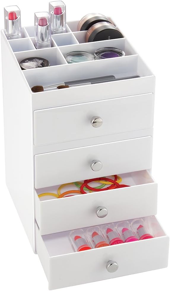 About this item Great organization for counter top or vanity Multiple compartments for various makeup items and brushes Two drawers on bottom for extra storage Durable White plastic with Chrome handles 12.75″ x 7″ x 4″ › See more product details