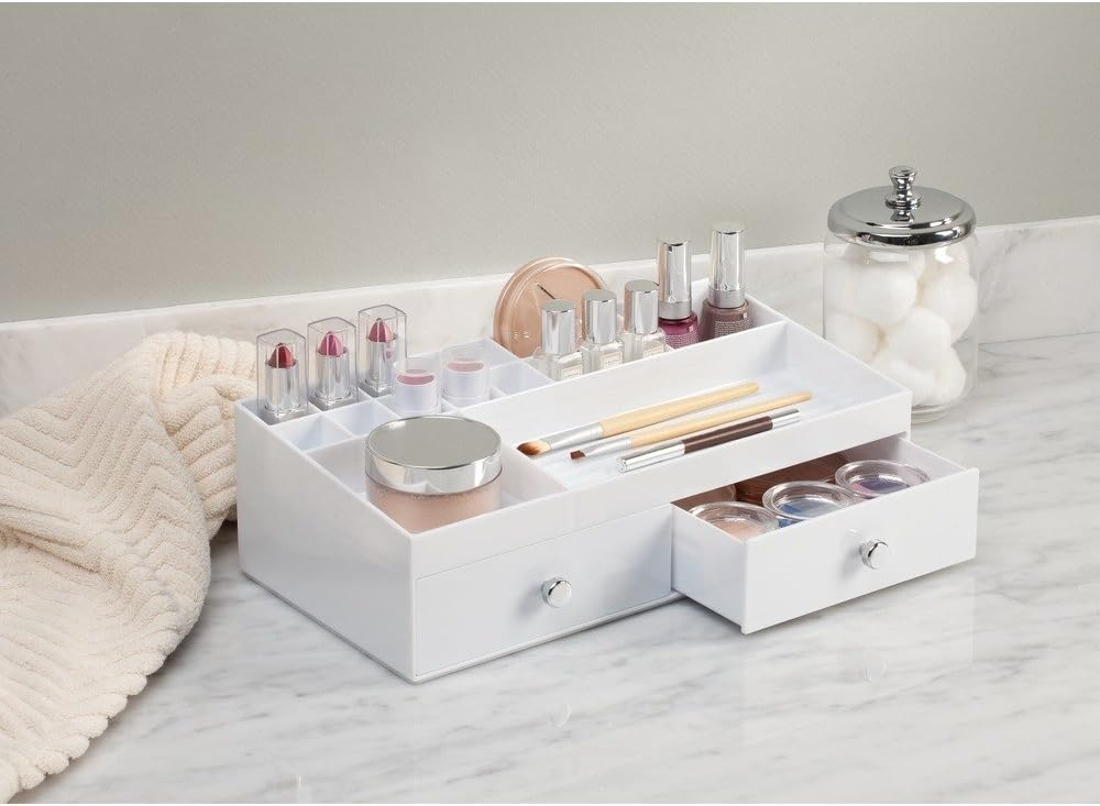 About this item Great organization for counter top or vanity Multiple compartments for various makeup items and brushes Two drawers on bottom for extra storage Durable White plastic with Chrome handles 12.75″ x 7″ x 4″