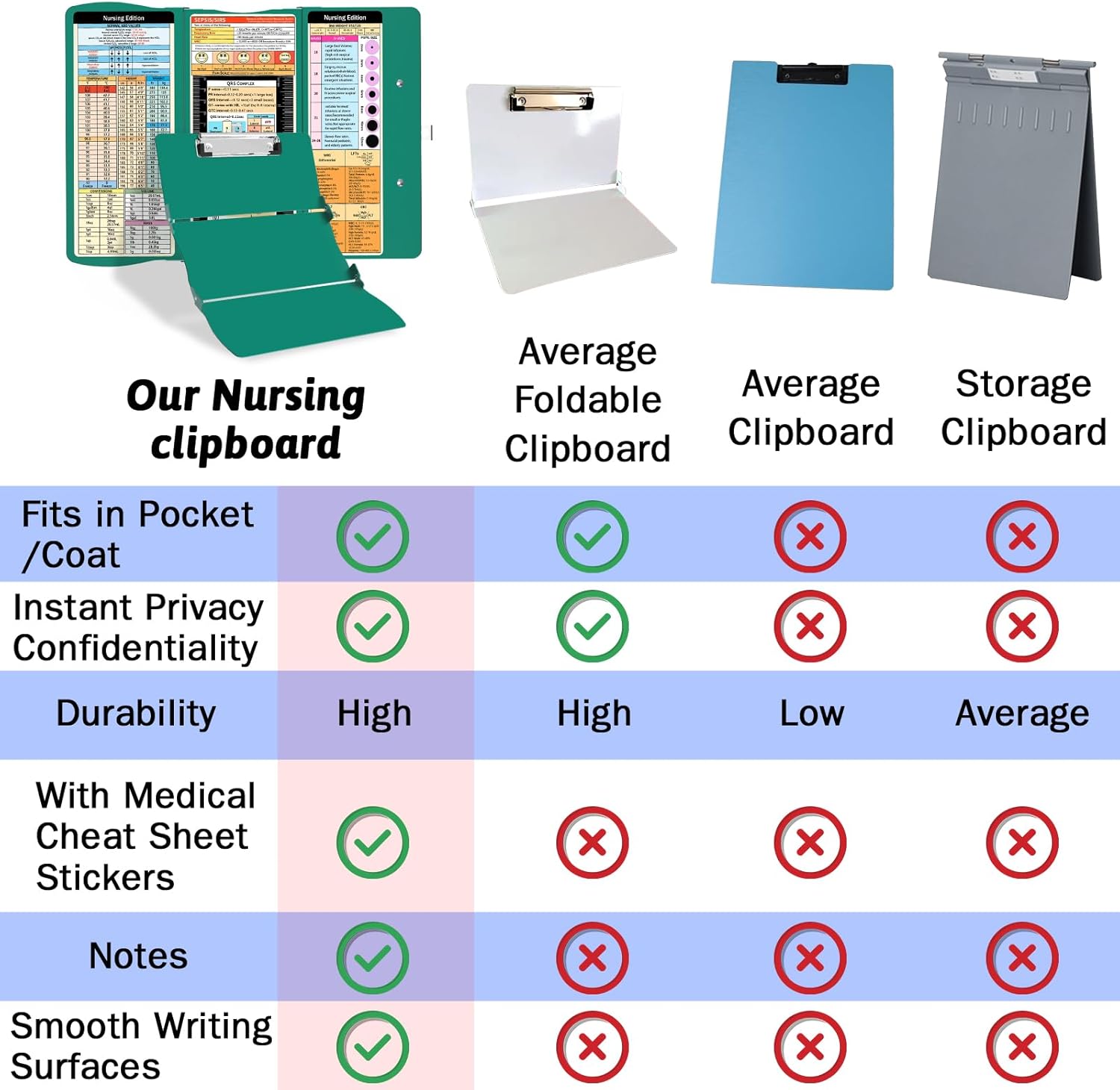 I had never used a folding clipboard in my 10+ years of nursing until I started a new job and bought this in December 2023. It has worked great and none of the stickers/info on the clipboard has worn off. Everyone I work with has asked where I got it and I let them know. A lot of the nurses I work with say it’s better than the one’s they have. I find myself reviewing the information on the clipboard quite often, especially for EKGs since I didn’t have to really know them until now.