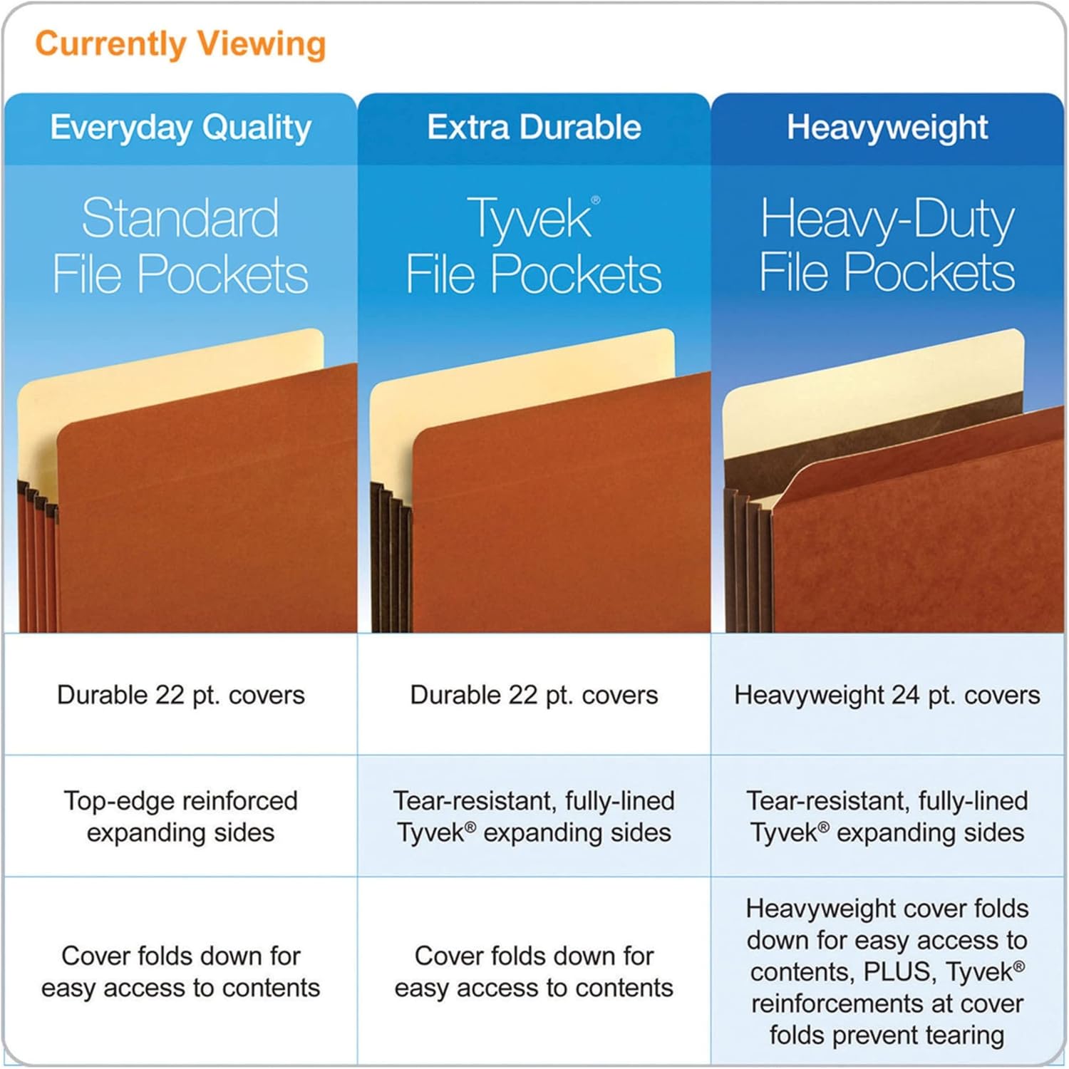 About this item STORE MORE INSIDE: These Pendaflex File Pockets have sides that expand 5-1/4″ to store your biggest projects—up to 1,050 sheets BUILT TALL AND TOUGH: 6-1/2″ high sides hold and protect papers of all sizes; top-edge reinforced with strips of tear-resistant Tyvek material STURDY ENOUGH TO REUSE: Double-thick manila-lined redrope panels provide lasting performance; holds 8-1/2″ x 11″ documents and smaller odds and ends KEEP IT WITHIN REACH: A fold-down front panel gives you open access to ongoing projects STOCK UP WORTHY: Get 25 straight-cut letter size file pockets per box and wave goodbye to clutter