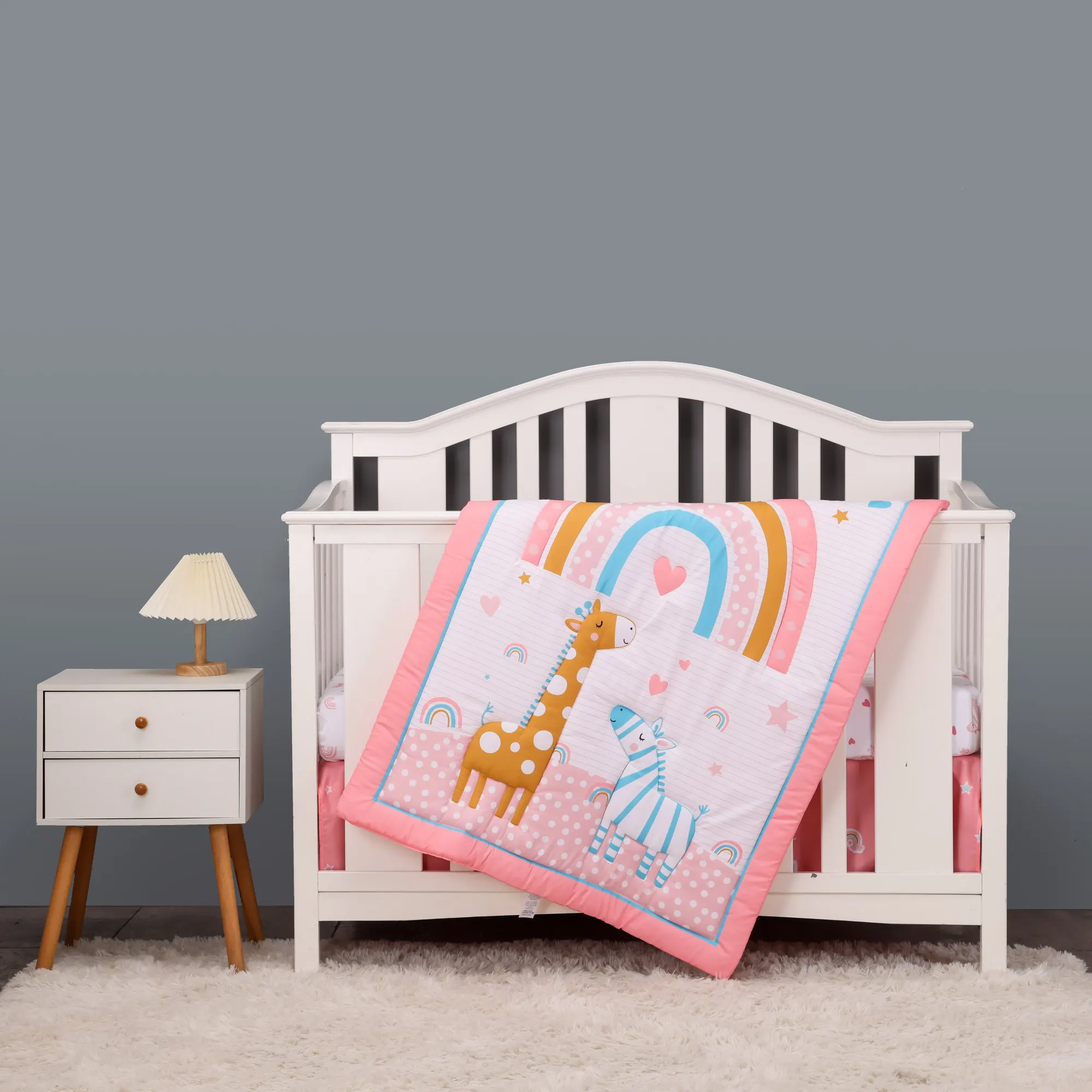 rainbow and girrafe design 3pcs baby bedding set including comforter, crib sheet, crib skirt for baby girl new born gift