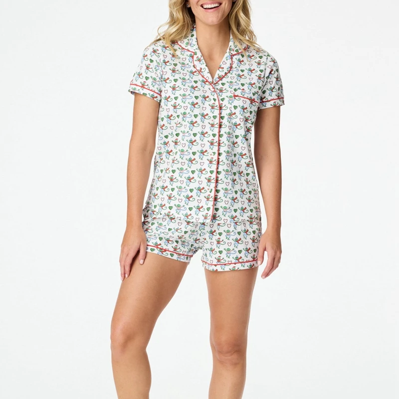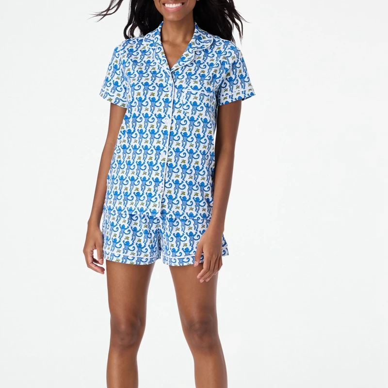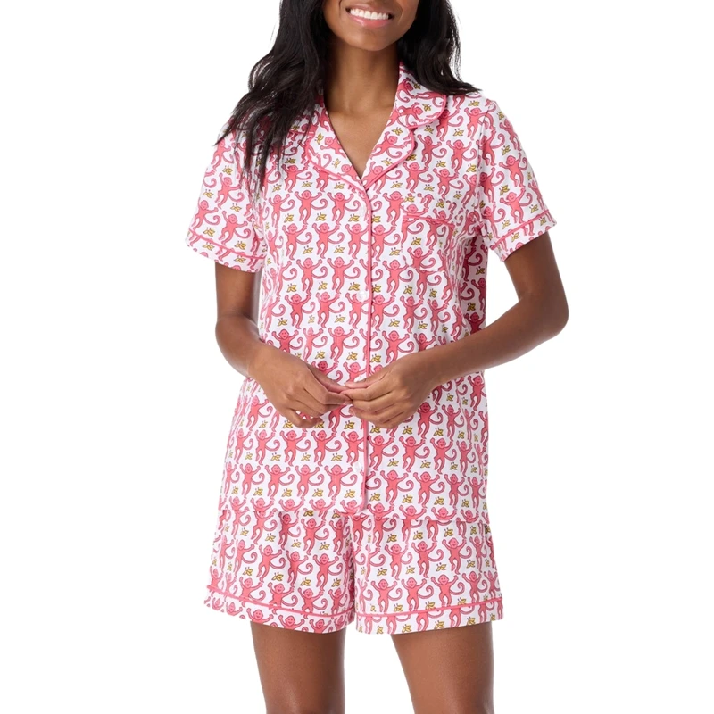 Rainbow Monkey Print Comfy Lounge Pajama Y2K Vintage Short Sleeve Blouse Shirt Top + Shorts 2 Piece Set Outfits Women Sleepwear