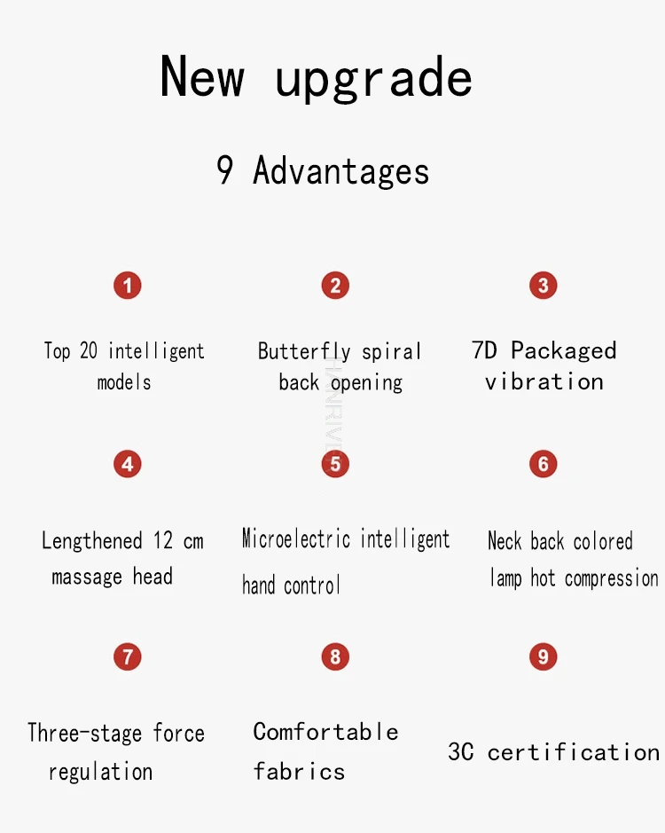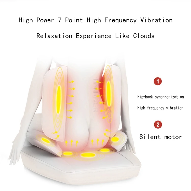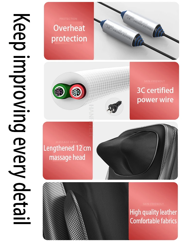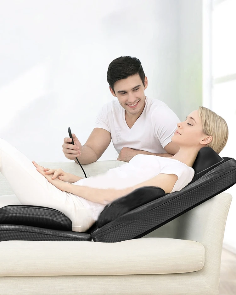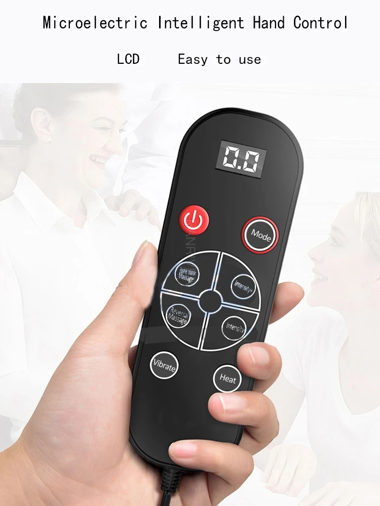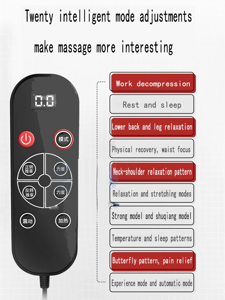 1) The design is quite luxurious. The neck is massaged with large balls forward and backward. 2) The back is designed as a Thai rolling massage ball with two vibration motors on both sides, which can massage the whole body effectively. 3) Neck and back are integrated, which can be massaged on the back. 4) The cushion has five vibration motors. 5) Large size design, suitable for too many people; 6) Various modes and speed regulation functions; 7) Massage ball has heating function. 8) Equipped with remote control, speed and massage mode can be controlled.