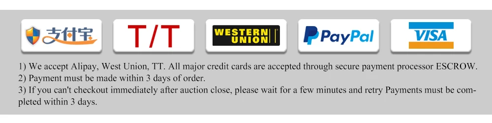 1) We accept Alipay, West Union, TT. All major credit cards are accepted through secure payment processor ESCROW.