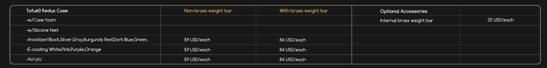 The Tofu60 Redux case doesn’t come with the internal Brass weight bar by default.