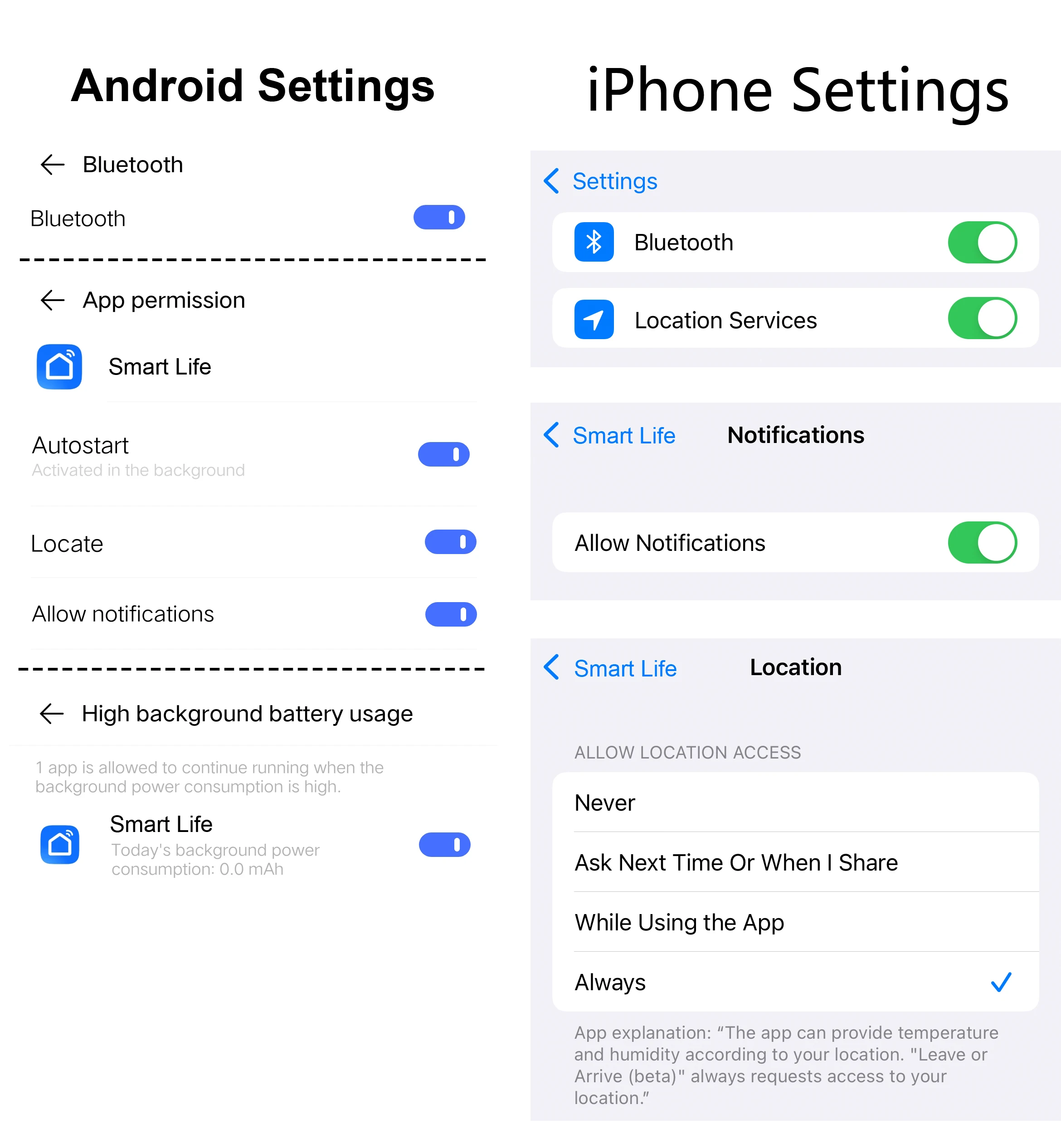 To make the smart finder work normally, please enable “Bluetooth” and “Locate/Locations” in cellphone settings, and allow “Smart Life” App to access the following permissions.