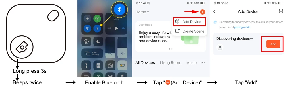 Long press the button 3s to power on the smart finder, confirm its indicator light is blinking, enable cellphone Bluetooth, open App and wait for several seconds, App will pop-up a dialog box, then tap “Add” icon to finish.