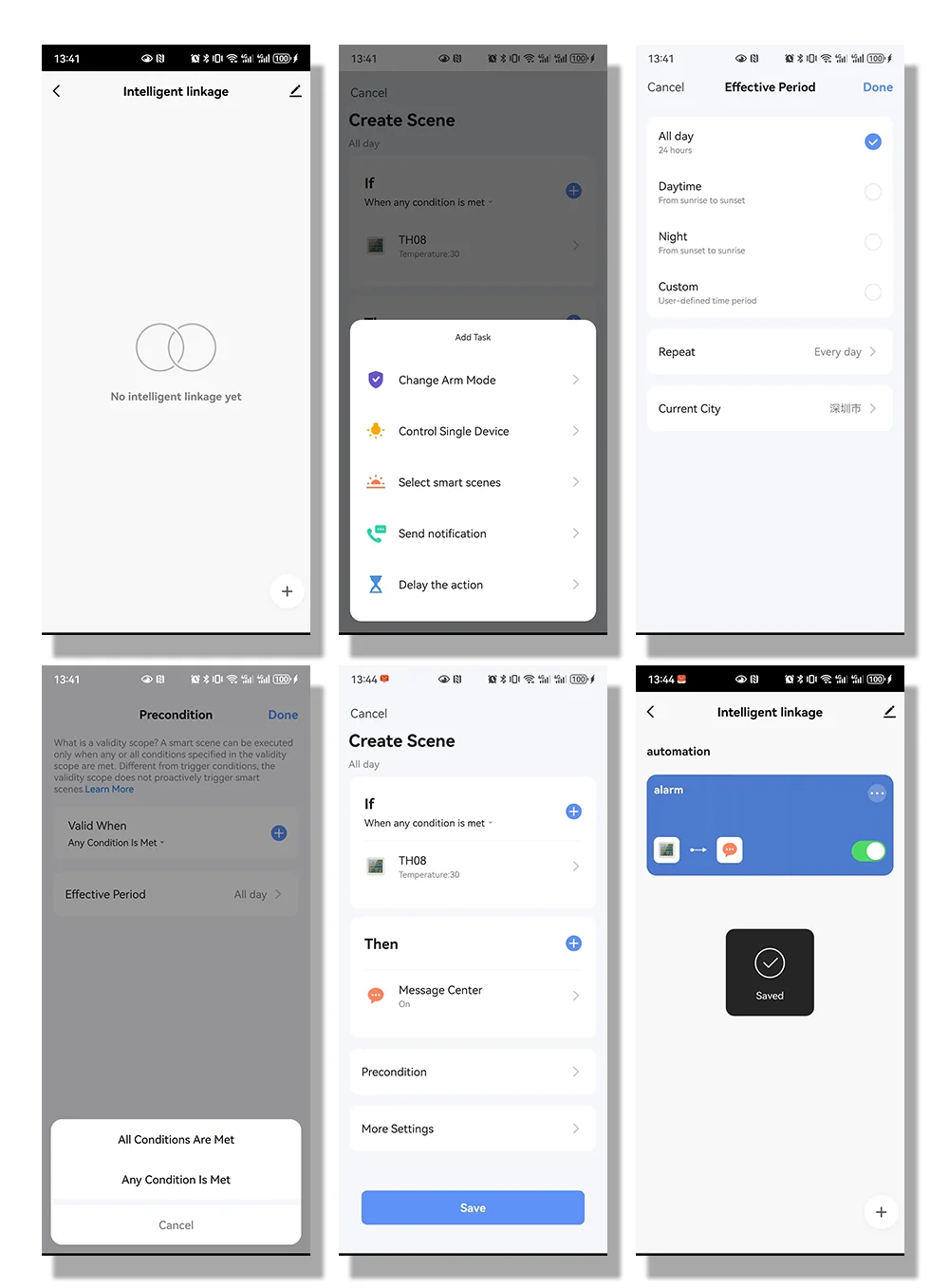 You can preset the range for the temperature and humidity in the Scene page, when the temperature or humidity reaches the range,you will receive alarm message on mobile.