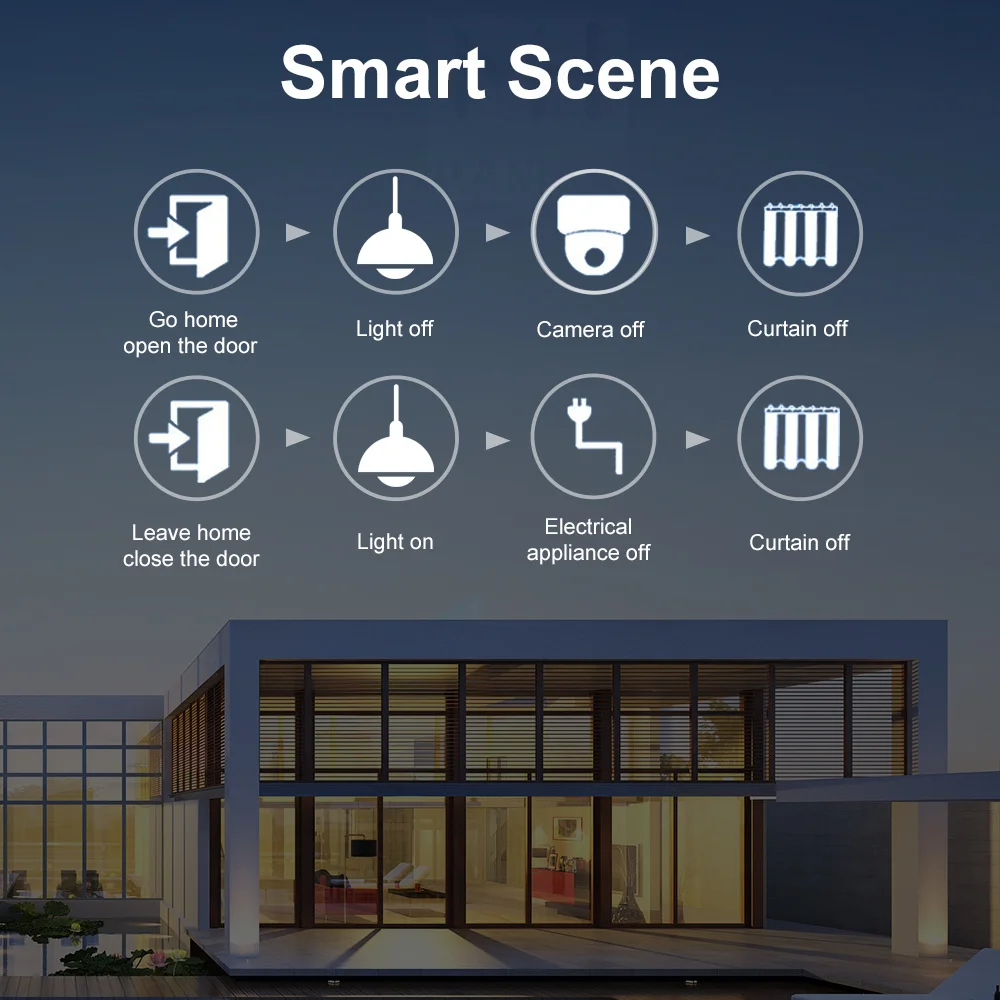 Smart Scene Creating your own scene to trigger ON/OFF home appliances by departure mode, home mode, temperature, humidity, or other environmental conditions.