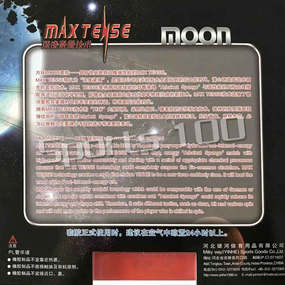 Yinhe Moon Max Tense (Factory Tuned) Pips-In Table Tennis / PingPong Rubber with Sponge