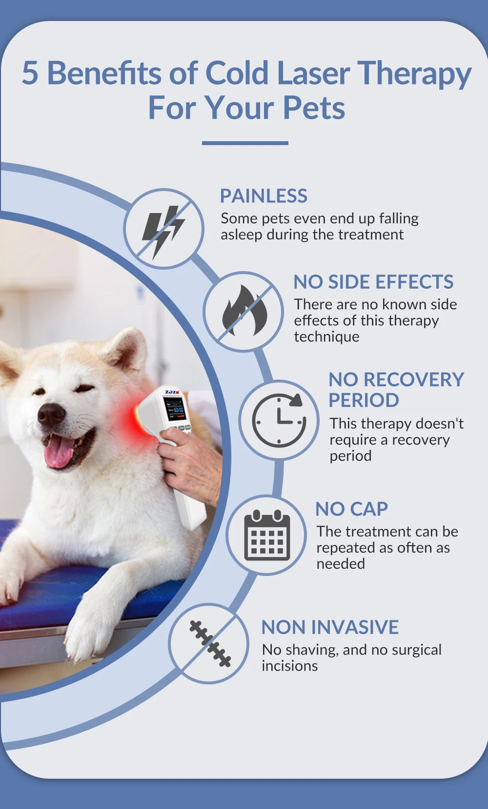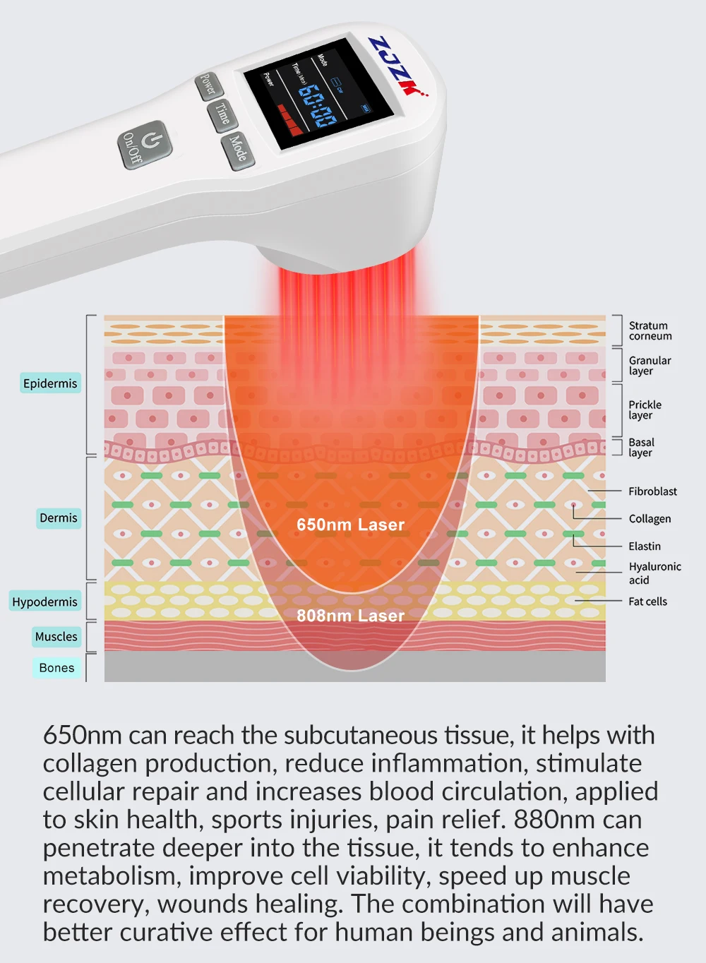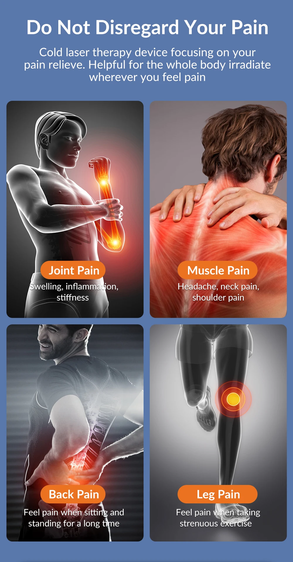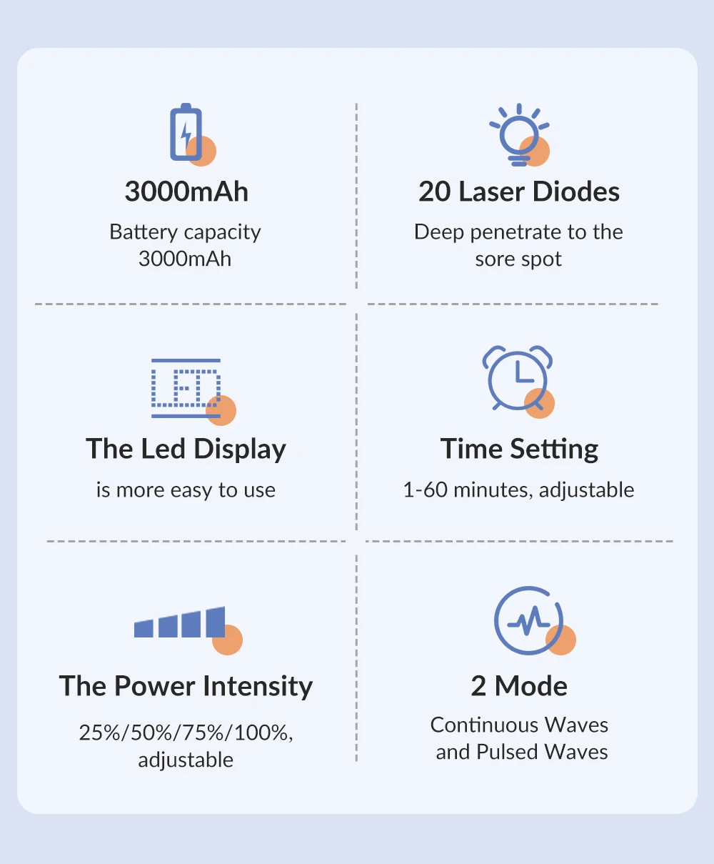 Faster efficacy. Compared with other low power laser therapy device, this model is stronger with faster efficacy for treating acute and chronic pain,inflammations, orthopedic conditions, sports injuries and wounds.