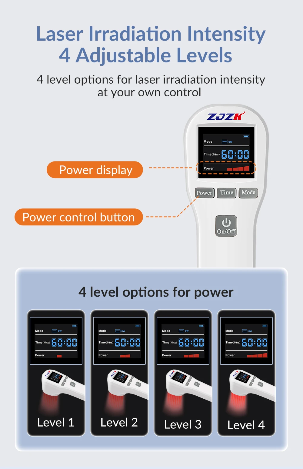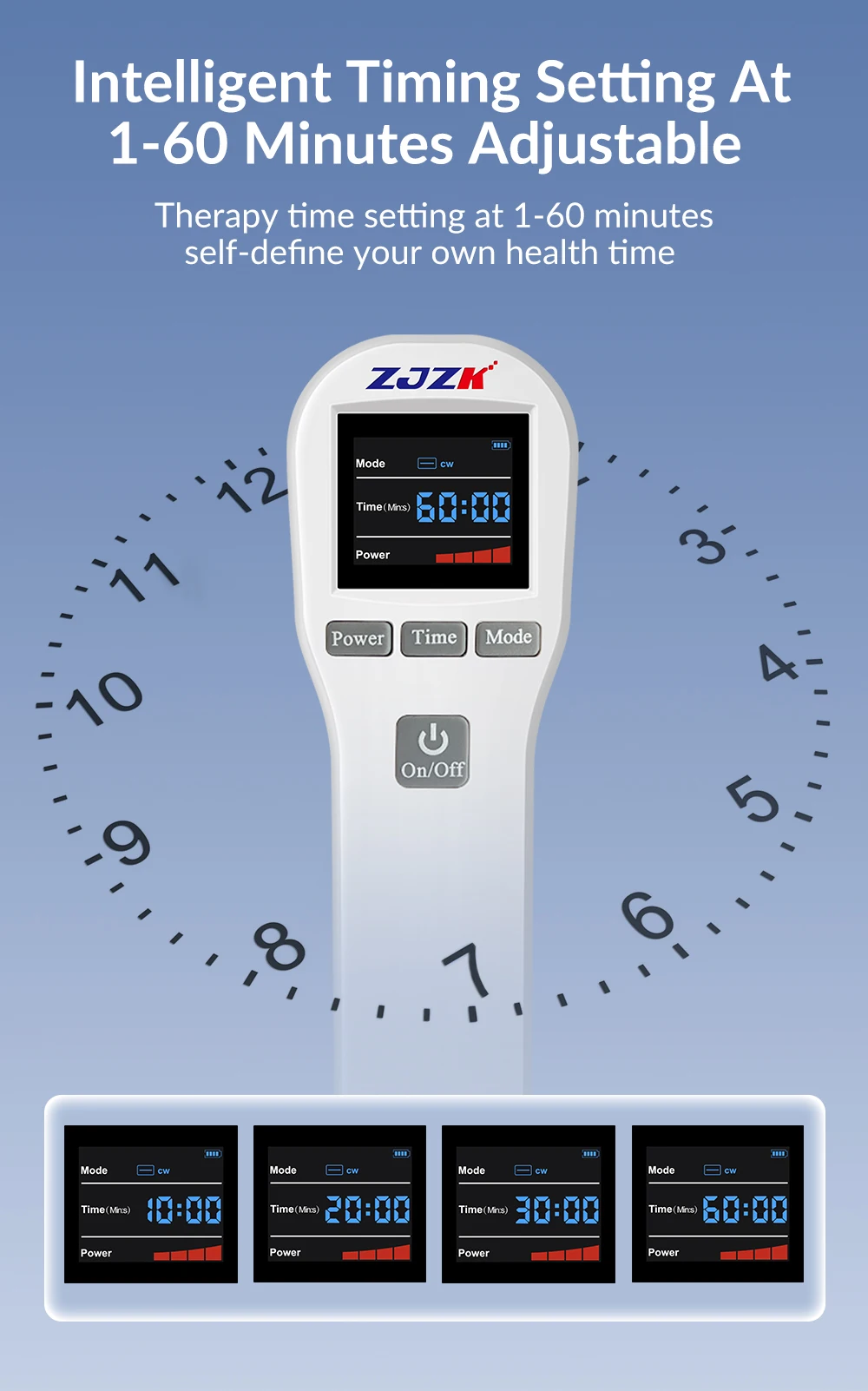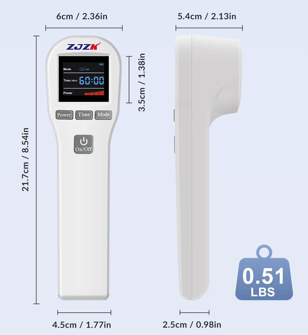 Multinational & Easy to use. Light, portable and rechargeable. Four Grades Power Adjustable (25%,50%,75%, 100%); Two working modes Adjustable: Continuous Wave & Pulsed Wave; Time: 1-60 Minutes Adjustable. The screen can shows the functions clearly. 1-2 times a day for 10 min to relieve your pain.