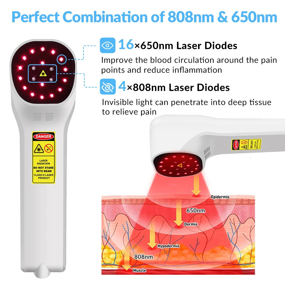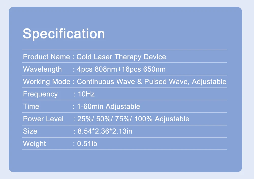 Powerful.The cold laser therapy device has 20pcs of (650nm and 808nm) diodes. It is strong enough to treat patients suffering from a range of conditions with less treatment time.